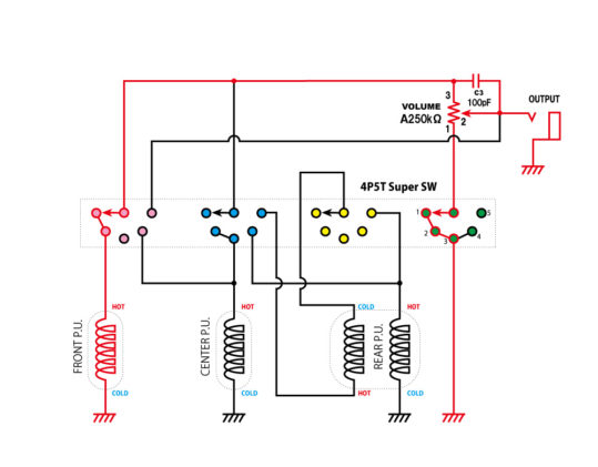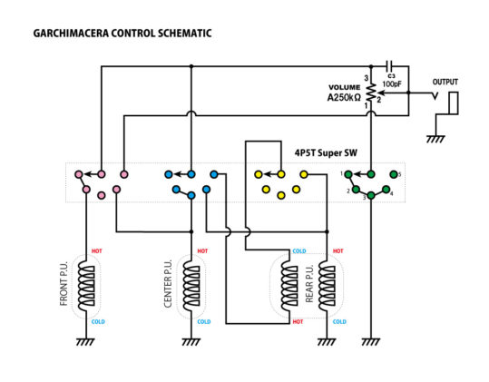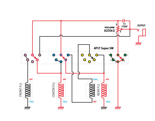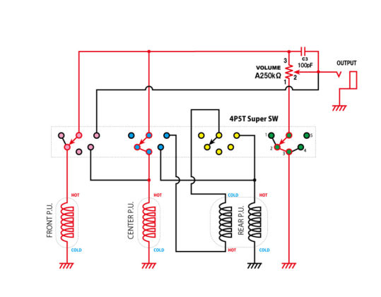 ちょっとこだわった点は、サーキット部分の配線です。Fender社製の4P5Tスイッチを使用しました。4P5Tとは「4ポール5スロー」の略称で、4つの独立した回路を同時に制御でき、各回路は5つの異なるポジション(位置)に切り替えることができるスイッチであることを意味しています。後述する2つの「ちょっとしたこだわり」の為に、このような複雑なスイッチを使うことになりました。実際の配線図がこちらになります。