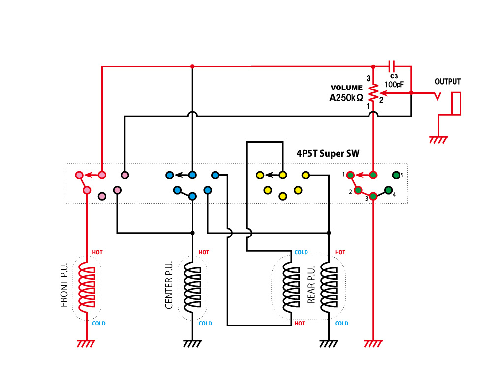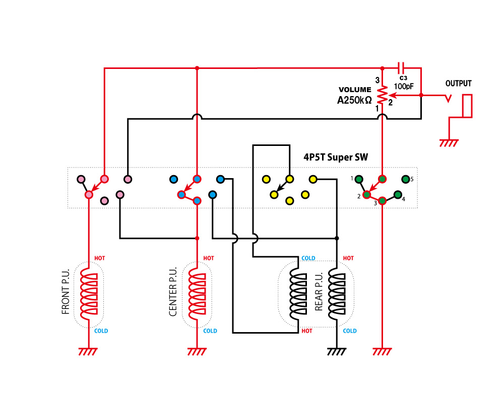 最後は、スイッチをリア側一杯に動かしたとき。リアピックアップの2つのコイルが直列(シリアル)で接続され、ハムバッカーらしいパワーのサウンドとなります。そして他のピックアップは回路から切り離れます。さらにこの時だけ、ボリュームが機能しなくなる上に、そのボリュームがグランド(GND)からも切り離されるので、高域の僅かな減衰すら防止しています。これが2つ目の「ちょっとしたこだわり」です。これを実現するために4P5Tスイッチが必要だったんですね。