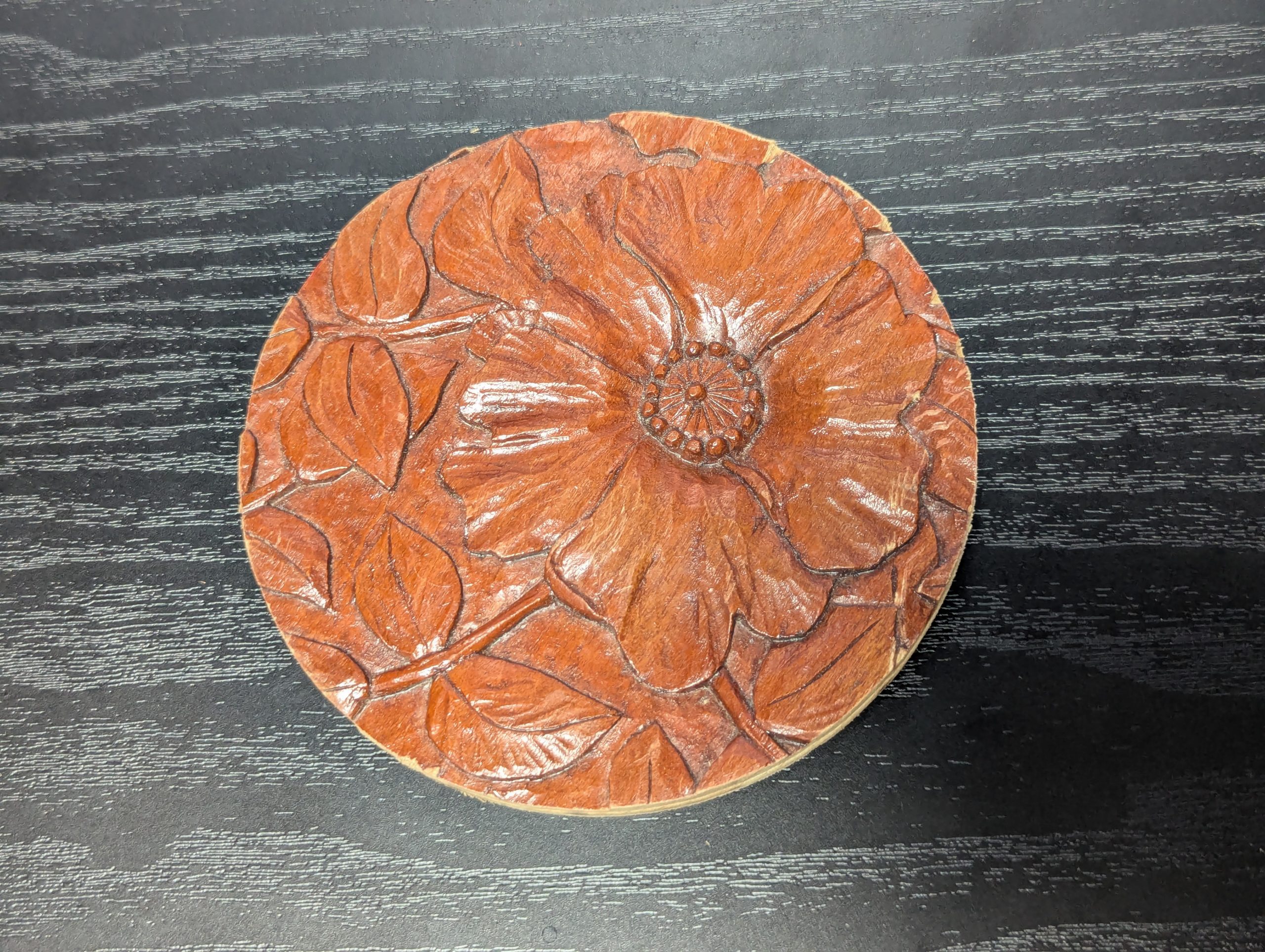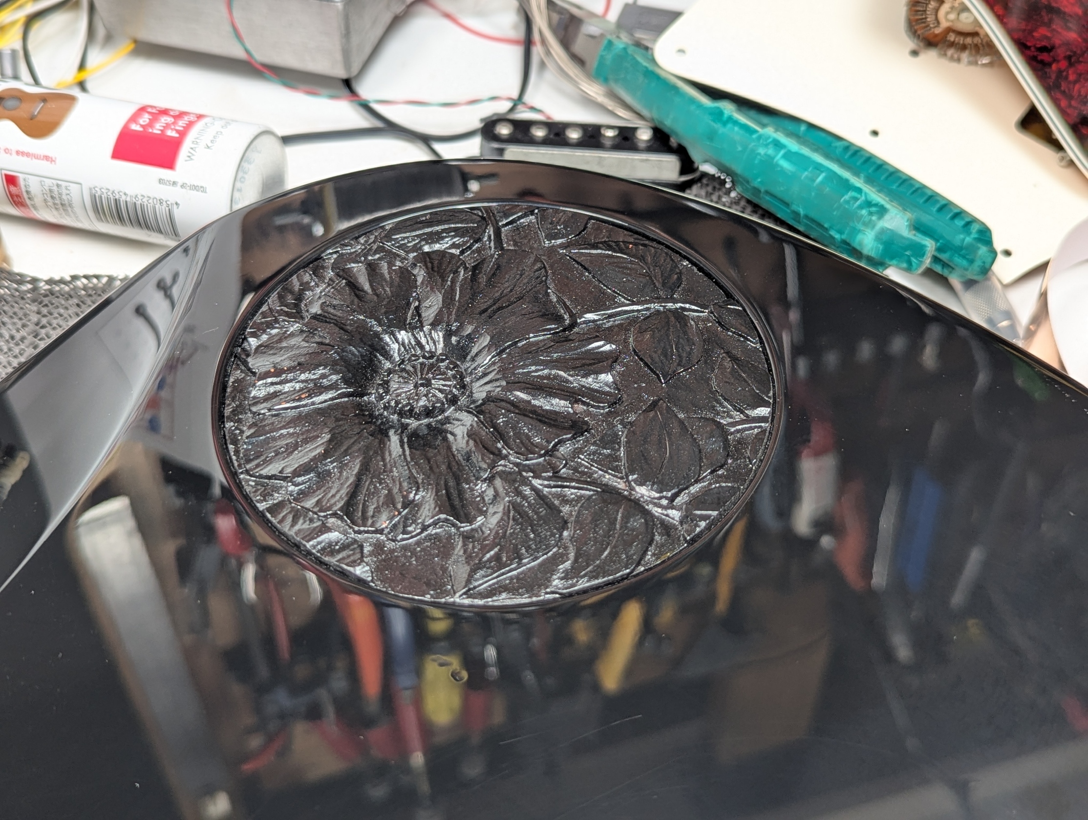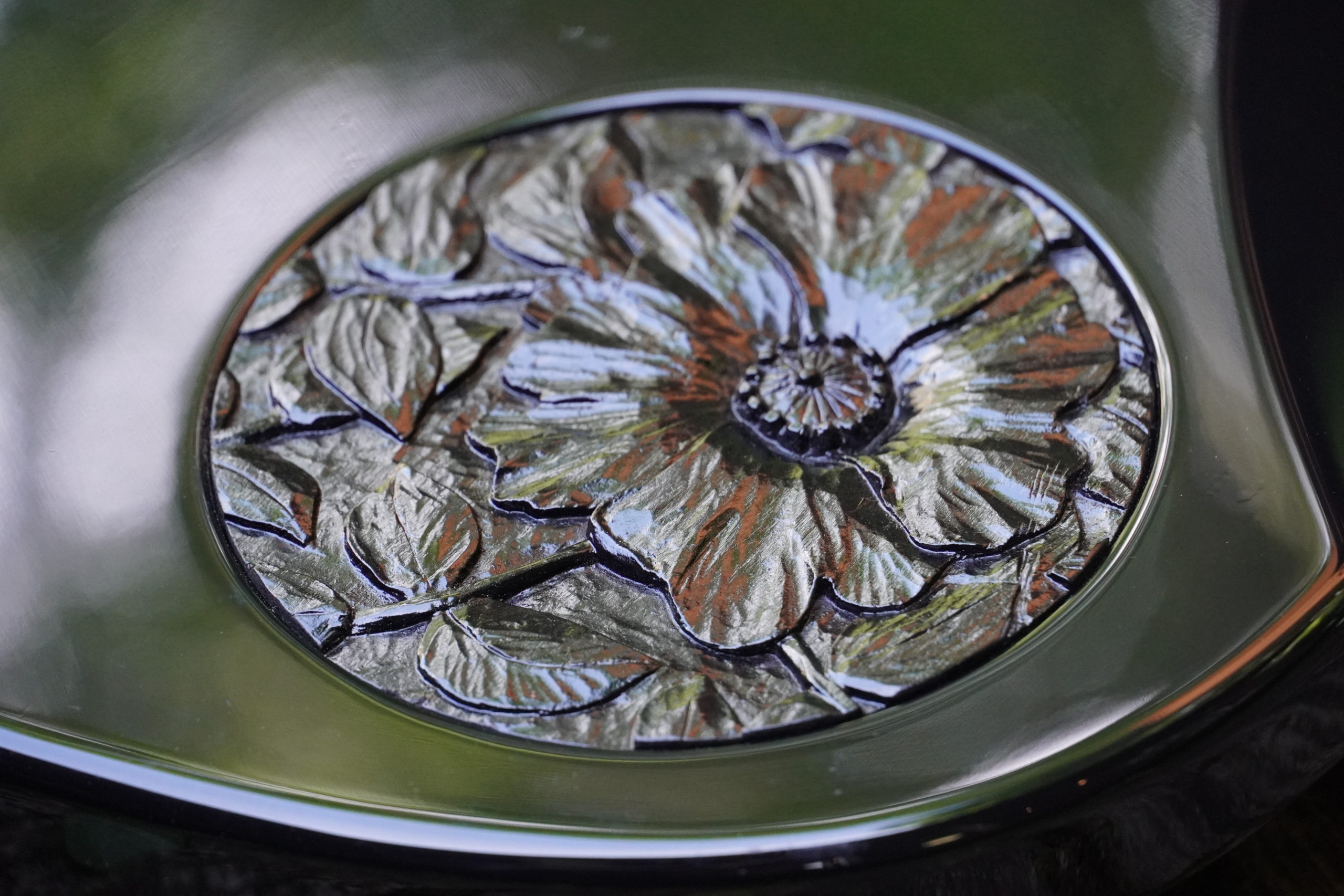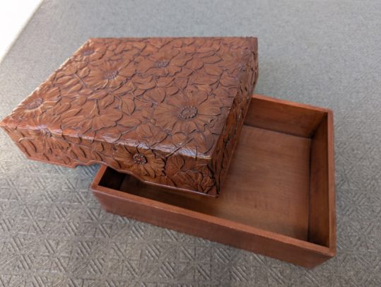 こちらの箱は、祖母が製作したもの。卒寿をとうに超えた僕の祖母は、数十年前まで彫刻を趣味としておりました。昨年、祖母の引っ越しの際に出てきた廃棄品として、この箱を貰ってきたんです。今回のギターを作る前から、この彫刻を装飾としてギターに取り付けたいと思っていました。ちなみに祖母はまだ元気に存命ですので、形見とかそういうのではありません。単純に彫刻のあるギターにしたかったんです。