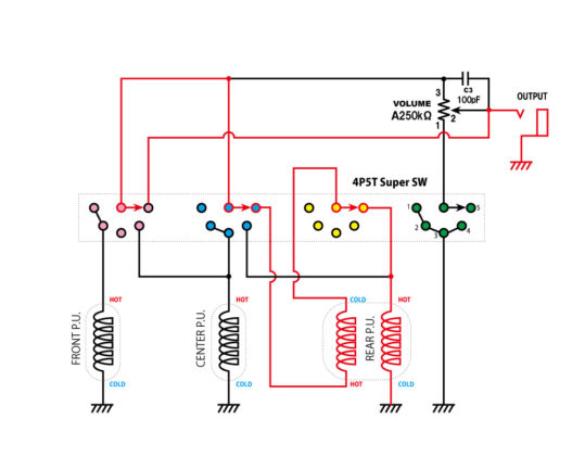 これだとわかりづらいので、それぞれのポジション時の回路を赤線で示してみました。まずはスイッチを一番フロント寄りにした場合。フロントピックアップだけが導通し、他は全て回路から切り離れます。さらにハイパスコンデンサ付きのボリュームが機能するようになります。