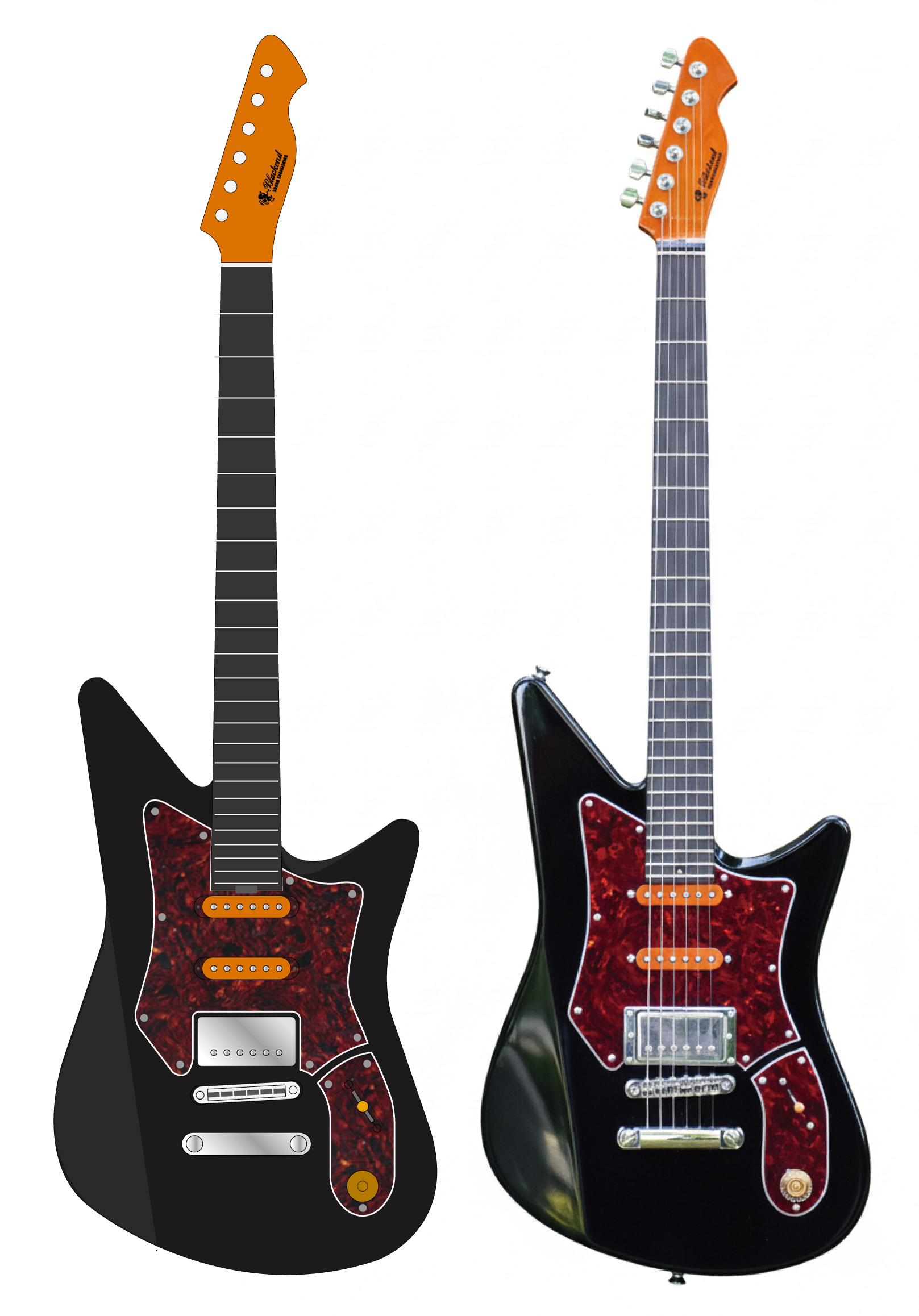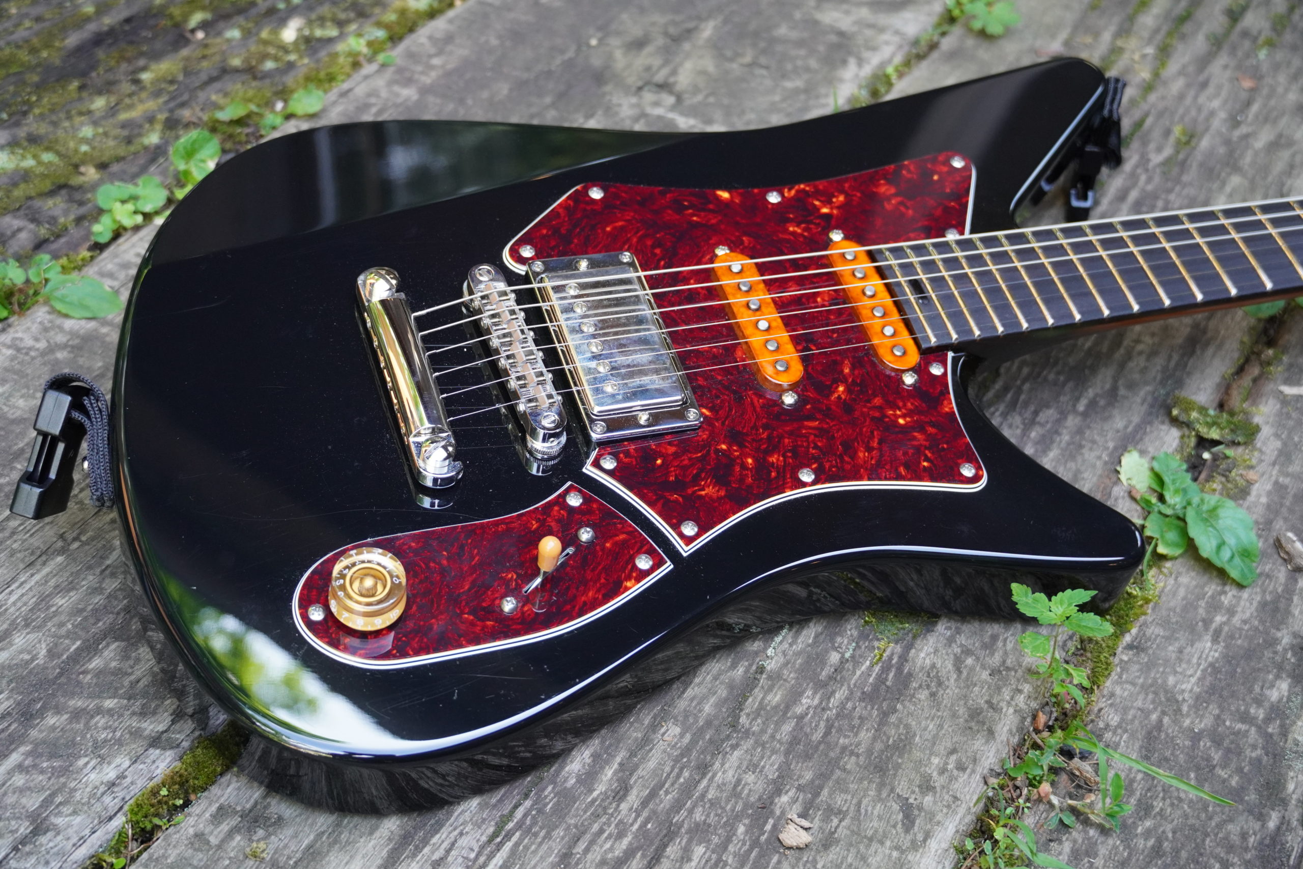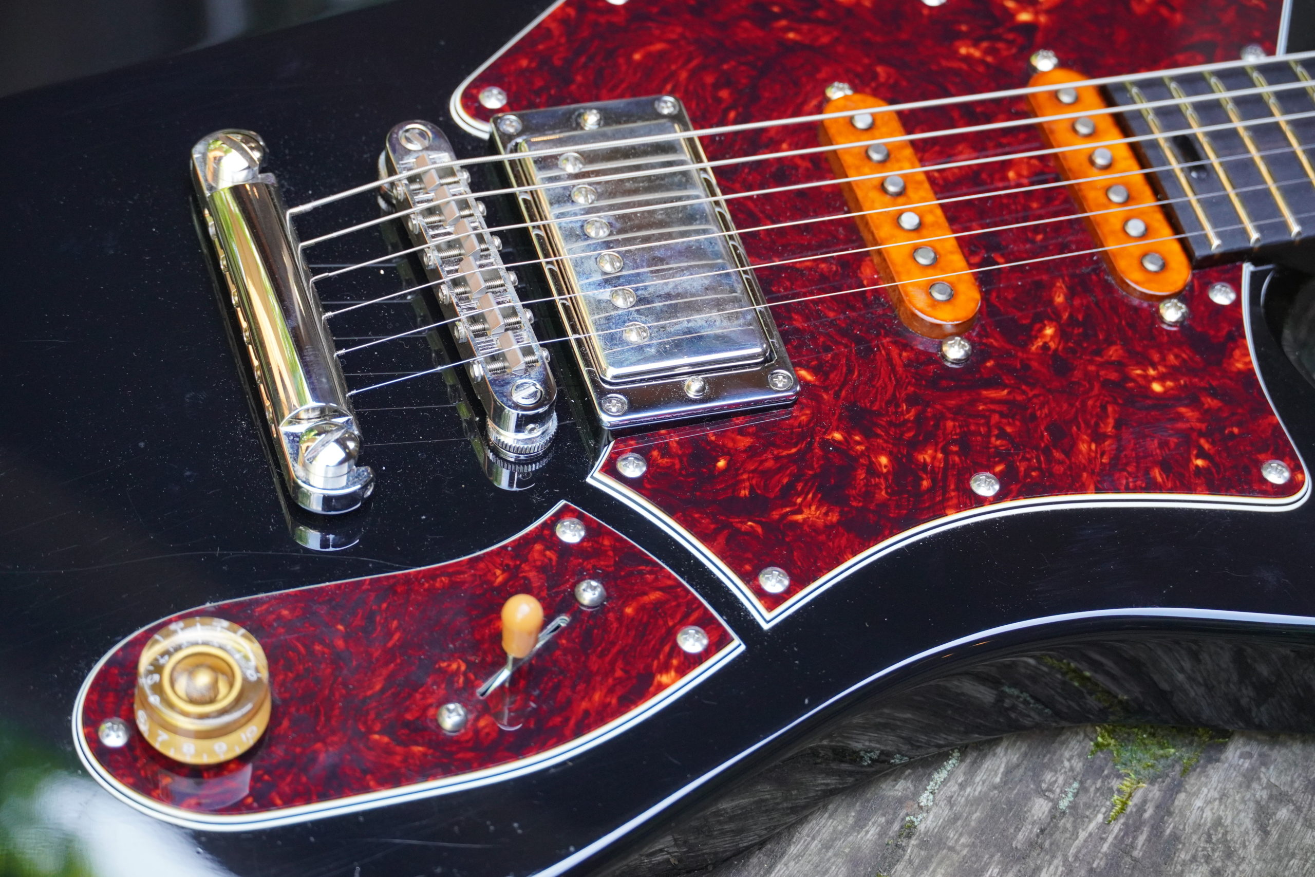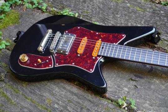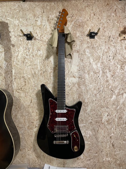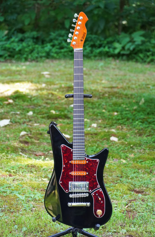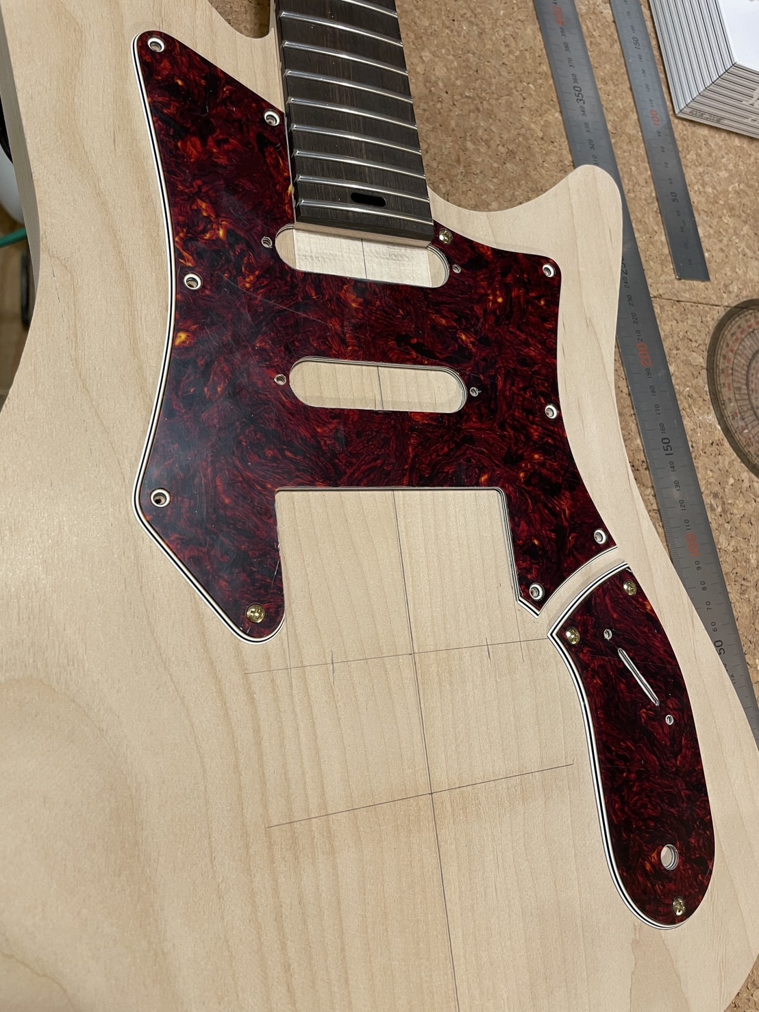 当然ピックガードの形も自分でデザインしましたが、かなりお気に入りです。日本のビザールギター感と、トラディショナル感、オーセンティック感にこだわりました。