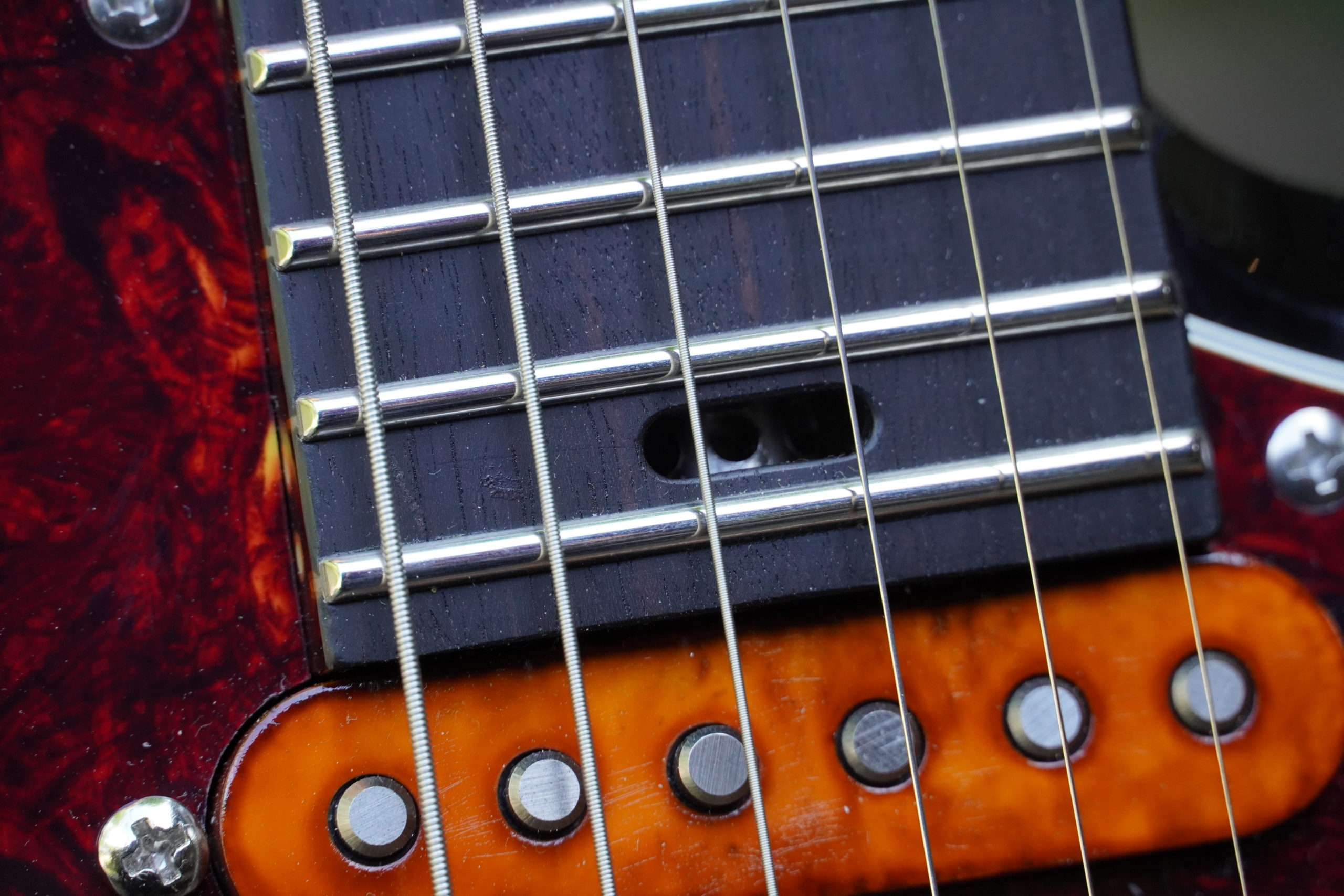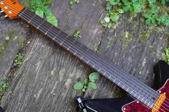 指板は以前からストックしていたエボニー(黒檀)材。ポジションマークは不要です。フレットはステンレスジャンボのJESCAR #57110 Stainless。所有のギターのフレットは全てこれにしてあるので、ここ20年、摩耗によるフレット交換などはしたことがありません。
