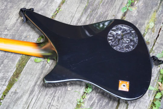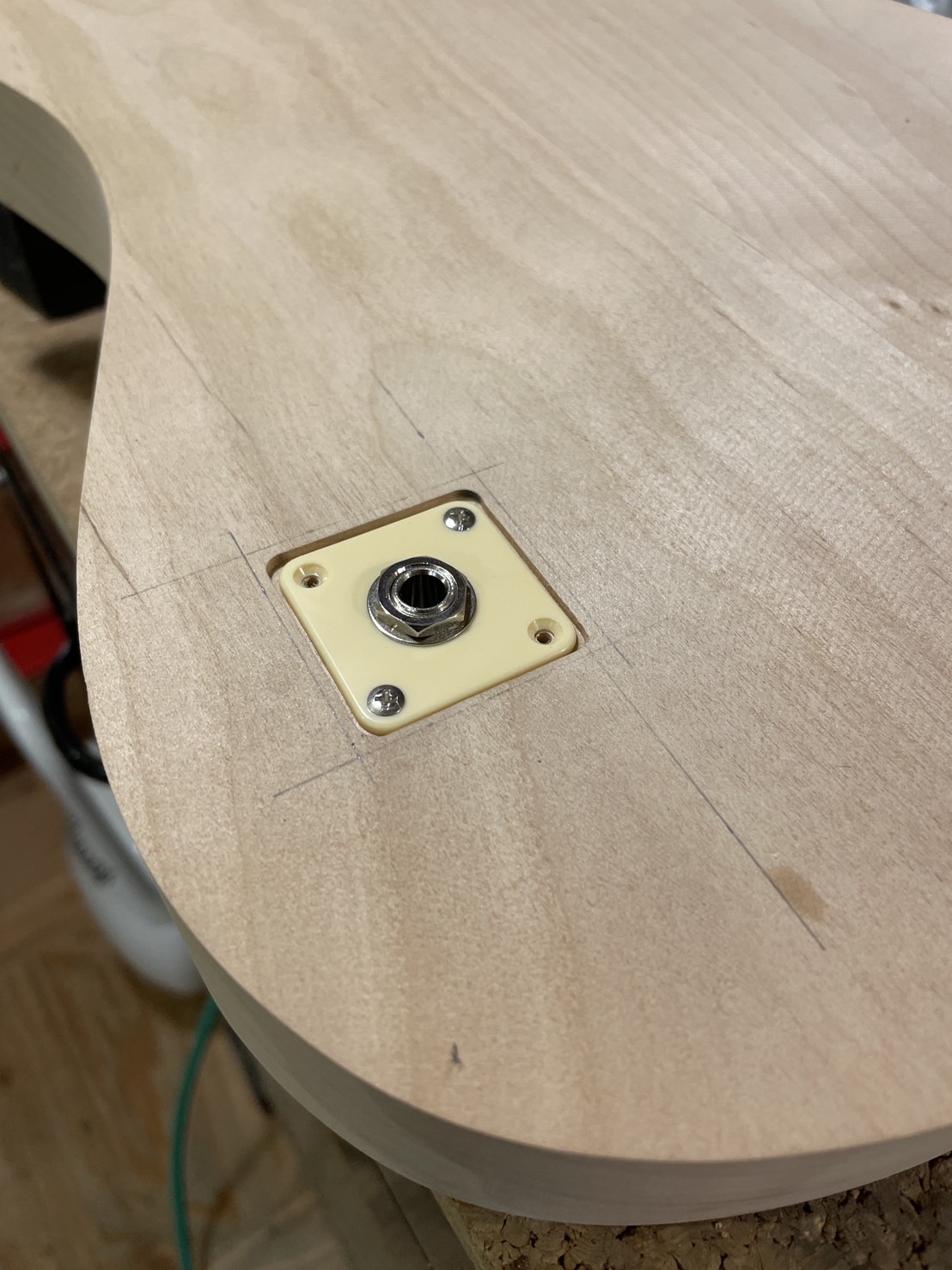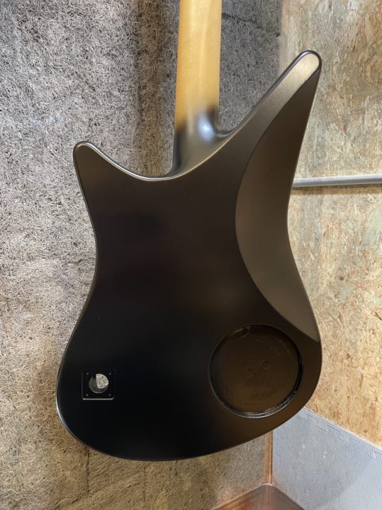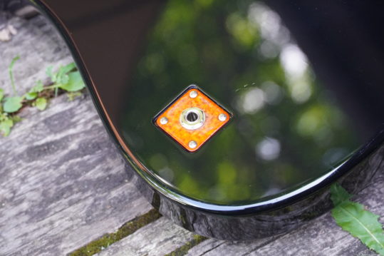 ボディ側面ではなく背面に取り付けたアウトプットジャック。これもこだわりの一つ。ジャックはすっかりお気に入りとなったPure Tone Jackです。