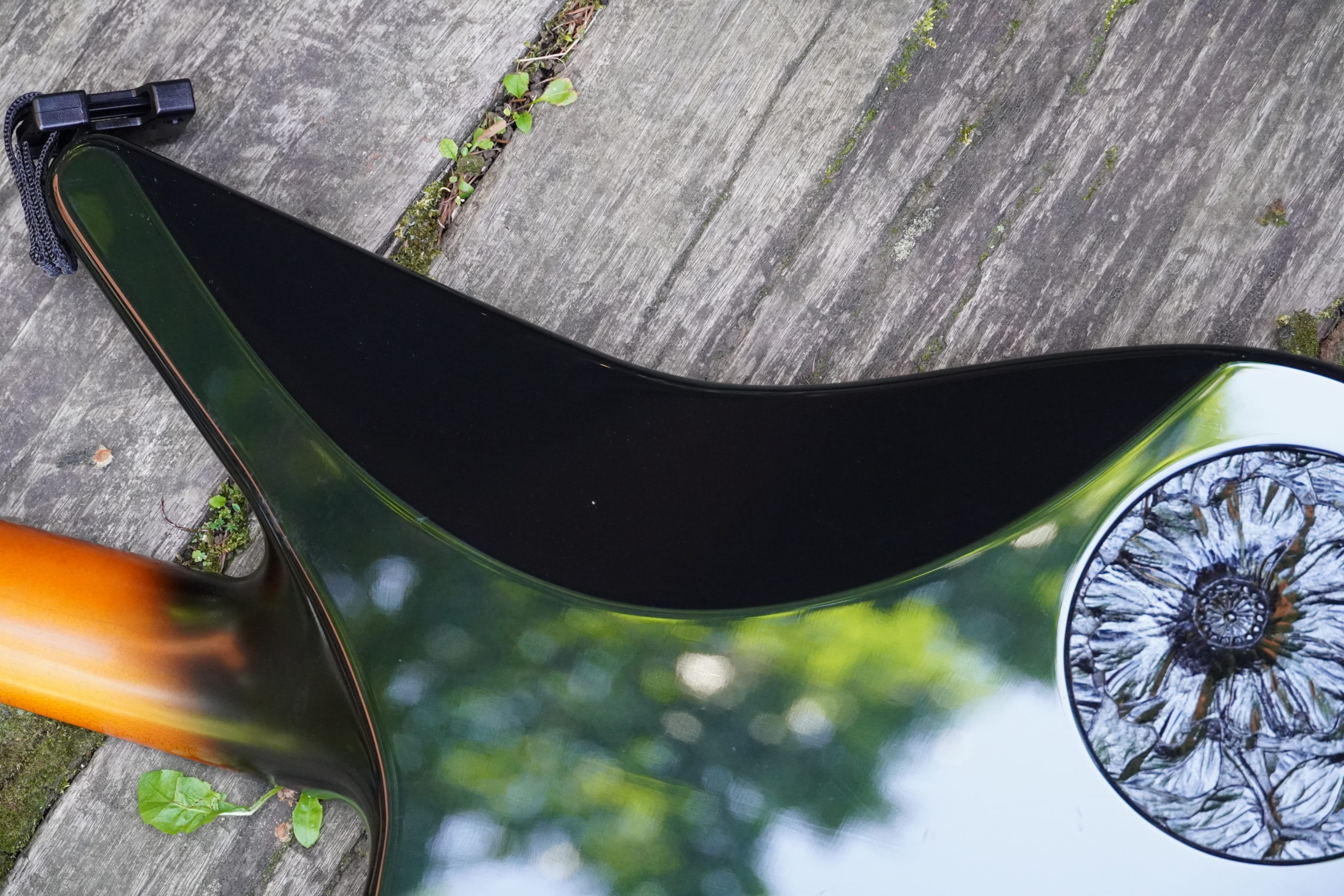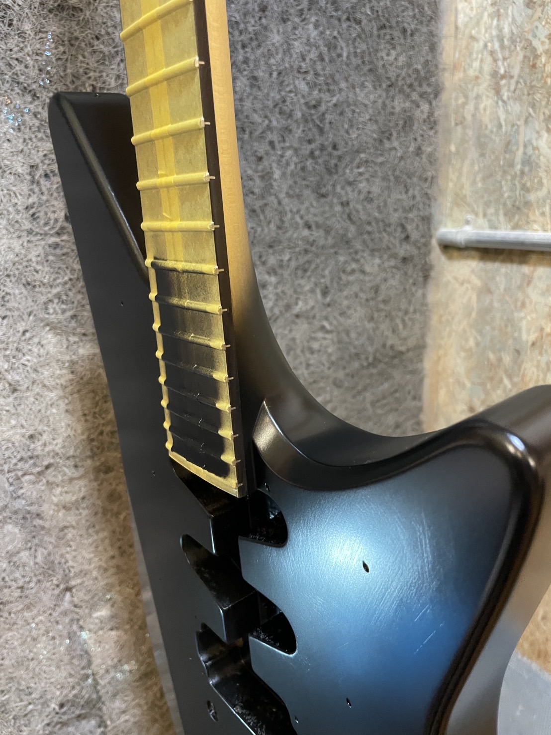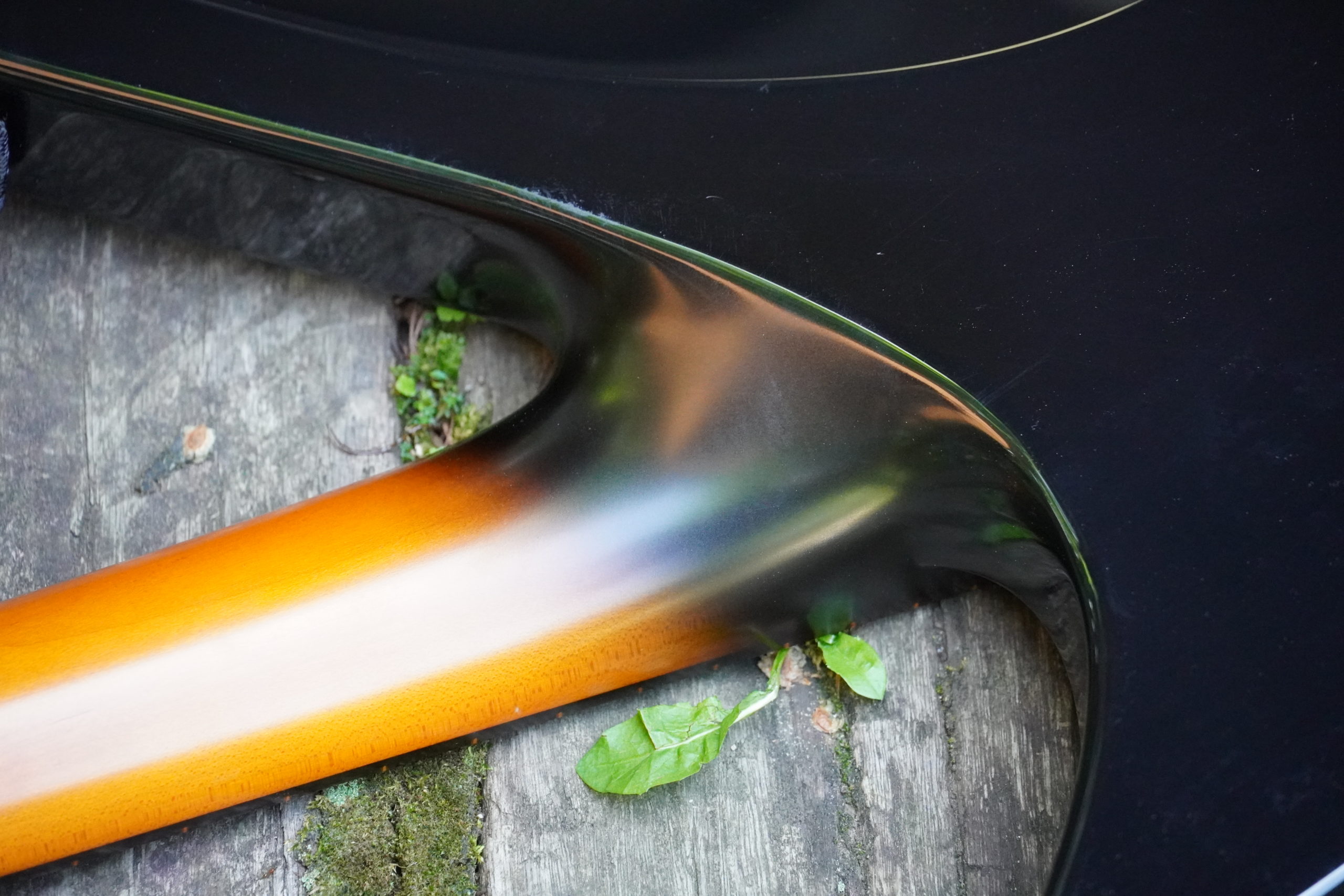 まるでスルーネックかのような接合部分ですが、セットネックです。ネックの仕込みもやや奥の方になってます。塗装の境界はグラデーションにしてもらいました。