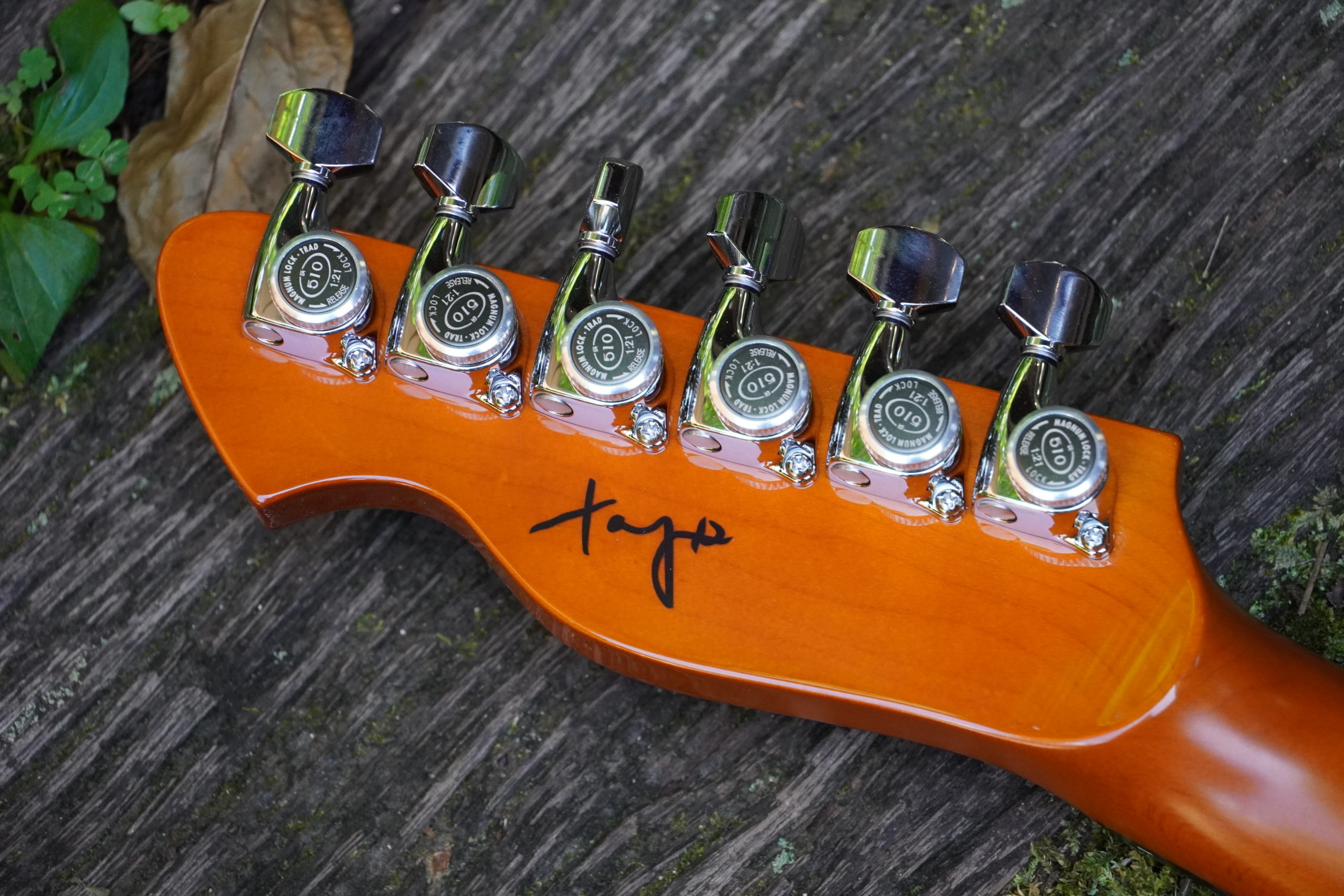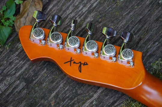 ヘッド裏には豊崎職人の「TOYO GUITAR」のロゴを入れて貰いました。本当はヘッドの表に入れて欲しかったのですが、僕のロゴとデザインが合わなかったり、スペースの都合で裏に貼っていただくことになってしまいました。すみません。