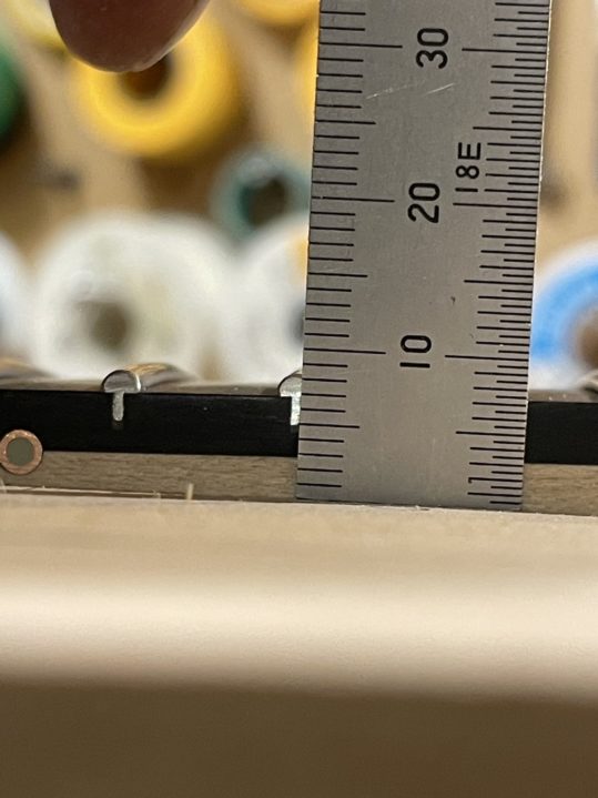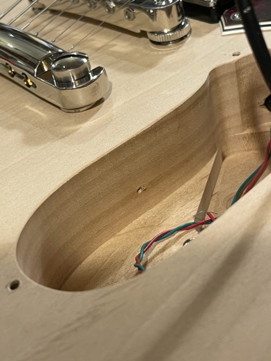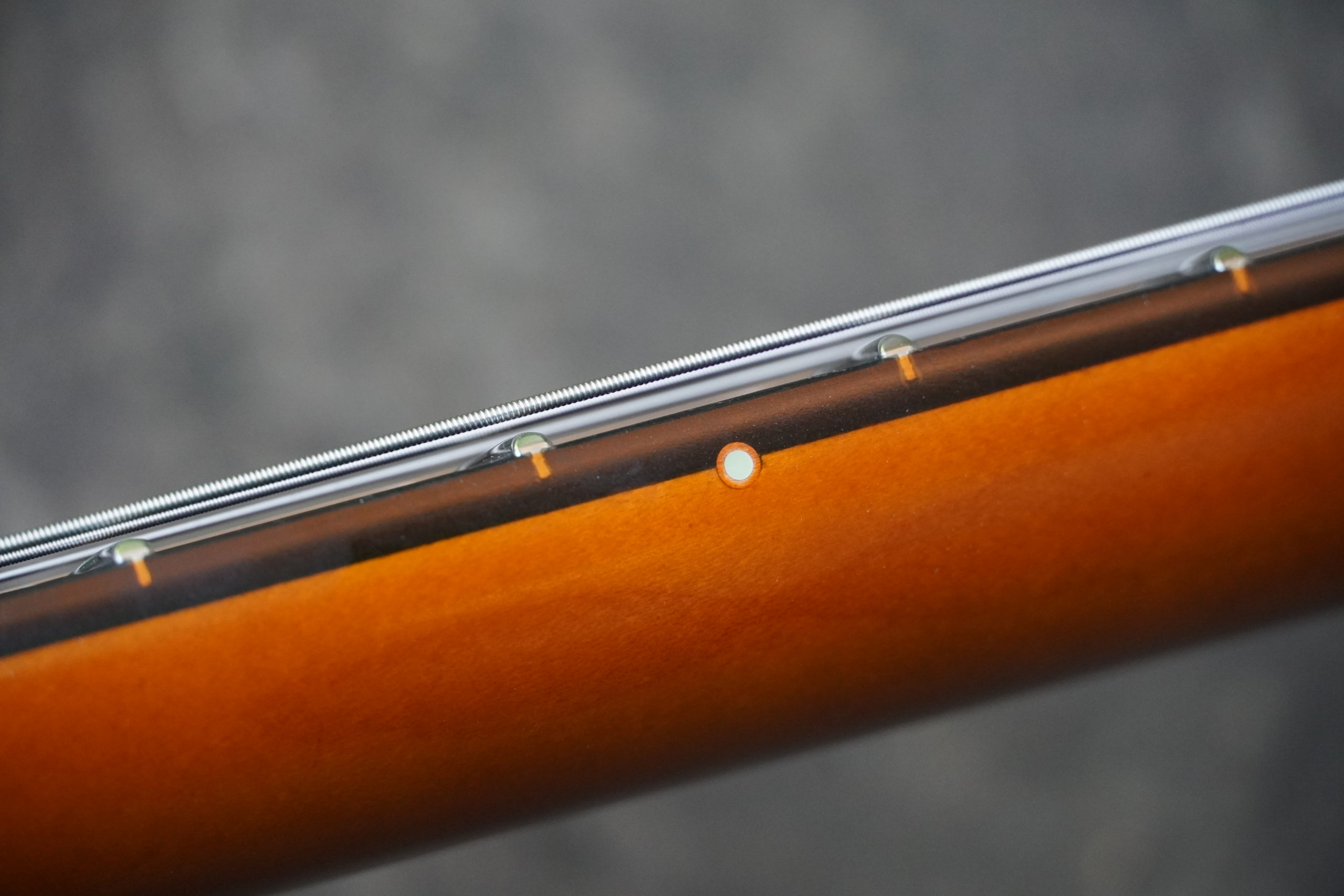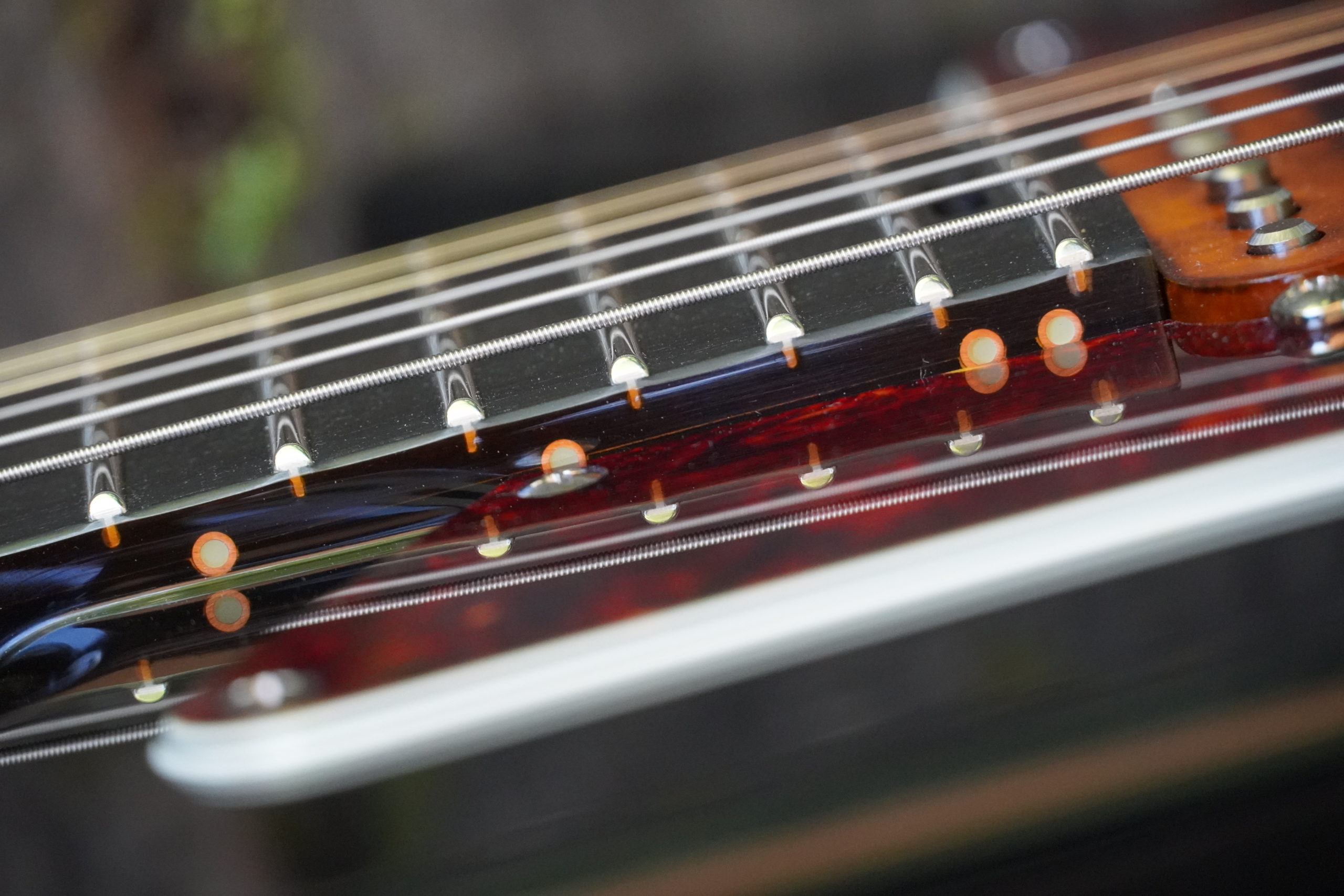 フロントピックアップをできる限りフロント寄りに搭載するために、トラスロッドの調整用のホイールを24フレットめの指板内部に配置してもらいました。ひそかなこだわりポイントです。ロッドカバーを外したりせずにすぐにロッドにアクセスできるので便利です。