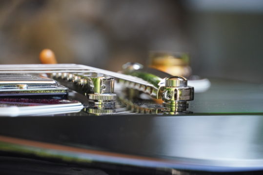 ブリッジとテールピースはGOTOH社製の普通のもの。自分でイモネジ用のネジ溝を切り、六角レンチでイモネジを締めることでロック機能を持たせました。所有のギターには大体この改造を施しています。またサドルはいつもグラフテック製ですが、今回のブリッジサドルは改造SGと同じくチタン製にしてみました。昔ほど弦を切らなくなったので。