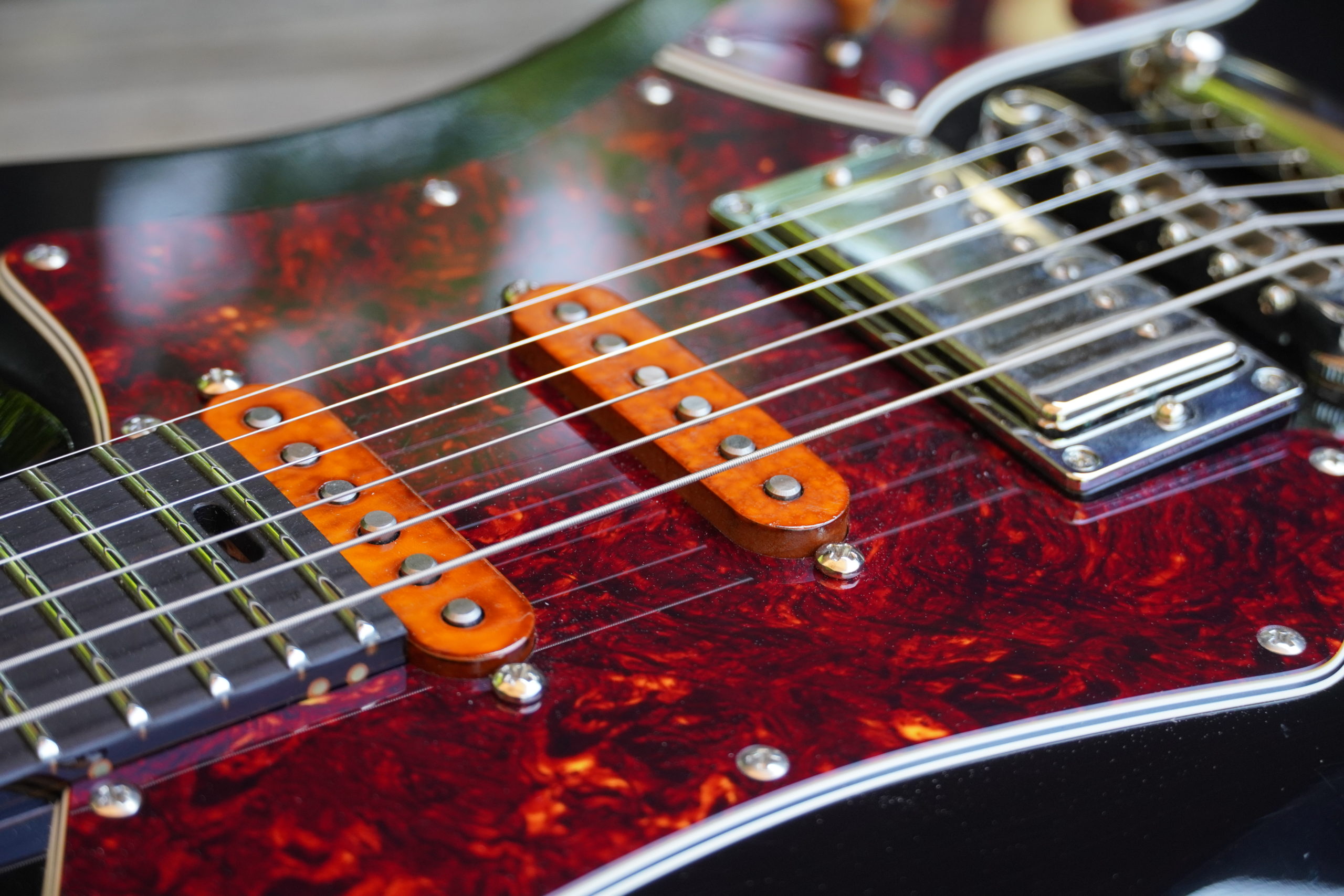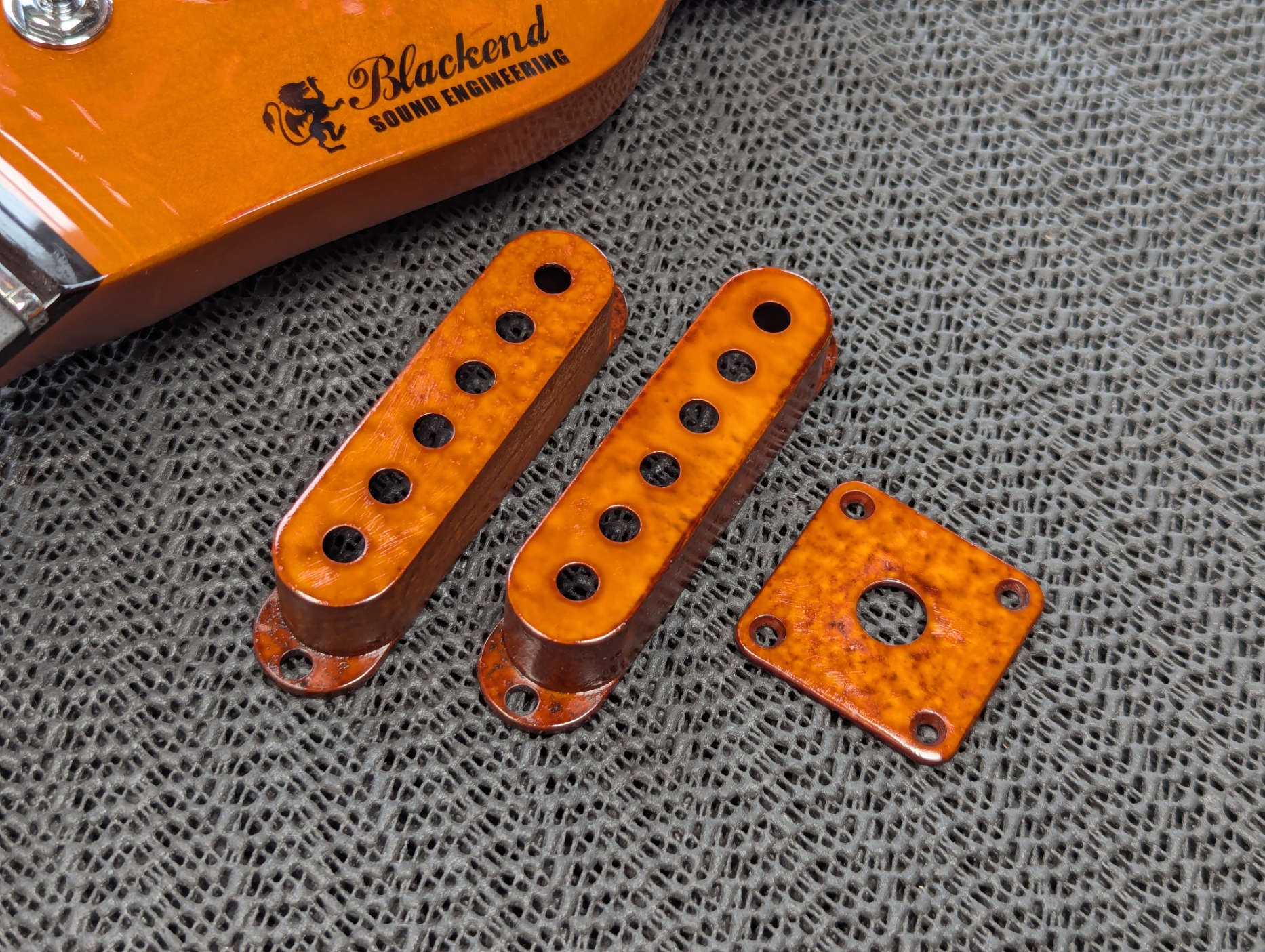 後半の製作写真でも言及しますが、偶然が生んだお気に入りのカラーのピックアップカバーです。フロントピックアップはDimarzioのDP408で、最近のメインのストラトに搭載されていたものと同じ。センターピックアップはDimarzioのDP416で、フロントと同じシリーズにしてみました。リアピックアップは、僕のオリジナルギターの全てに搭載しているSEYMOUR DUNCANのSH-55b Seth Lover Bridge NICKEL 4Cです。コイルタップできるように4芯モデルです。