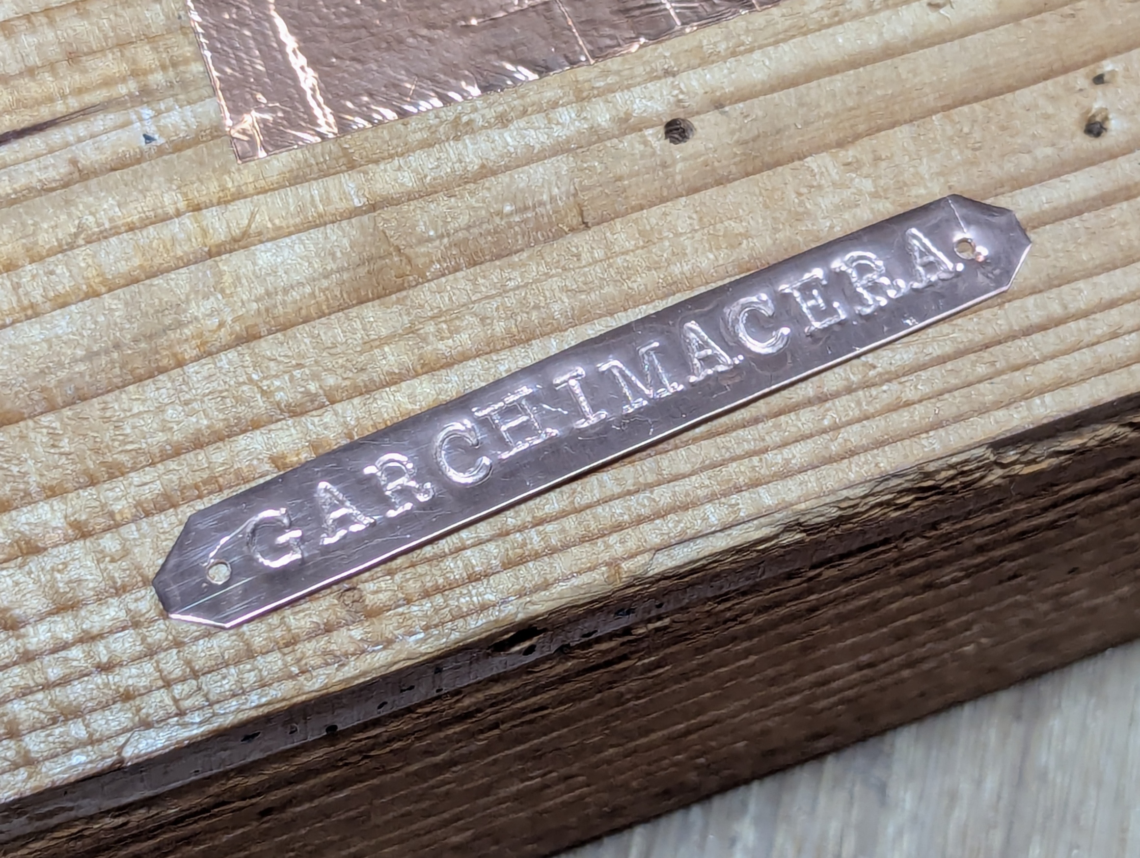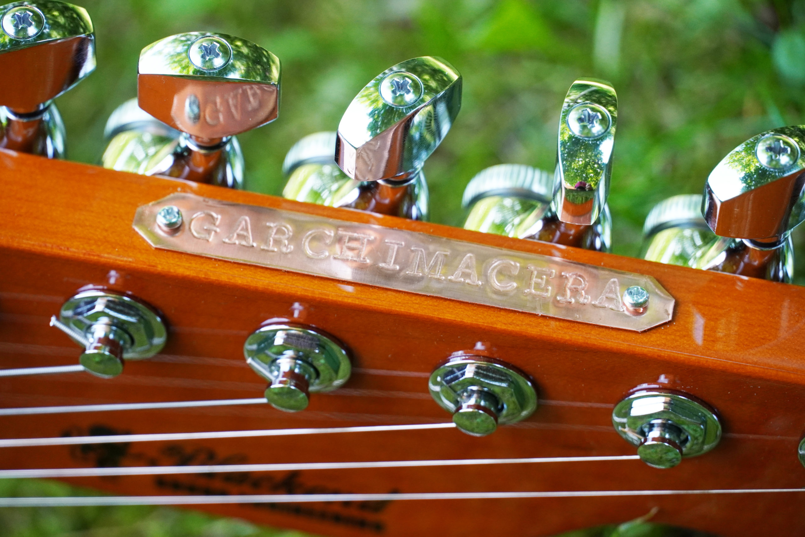 個人的遊び心で、ヘッド側面にこのギターの名前「ガルキマセラ(GARCHIMACERA)」を入れてみました。銅板をカットして、刻印棒で1文字ずつ打ち込んだのですが、やや素人レベルの仕上がりです。でもお気に入り。