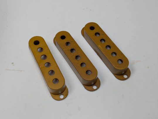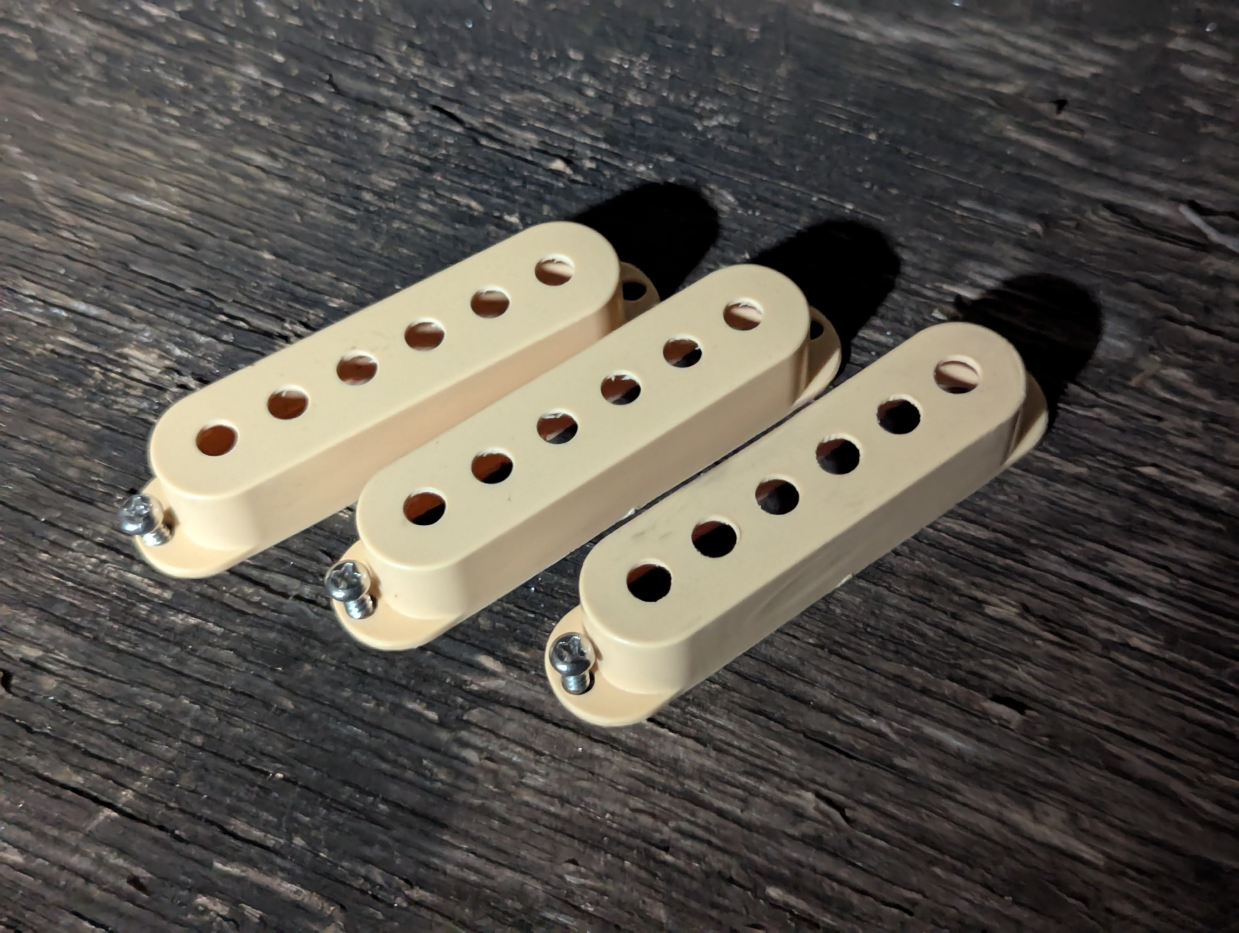 こちらはDimarzioのピックアップカバー(クリーム色)。どうも新品感が嘘くさいので、ネジで固定して、4、5か月ベランダで雨ざらしにしてみました。しかしながら一切の劣化もせず、新品同様で驚きです。全然良い風合いにならない。しかも、今回選んだフロントピックアップDP408とセンターピックアップDP416は、Dimarzio社の製品にも関わらず、このピックアップカバーが合致しませんでした。酷い。