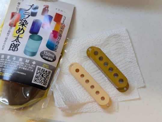 そこでDP408とDP416に最初から付属していた白いピックアップカバーをプラ染め太郎で染色することにしました。下はサイズが合致しなかったクリーム色、上が黄色と茶色で着色したもの。