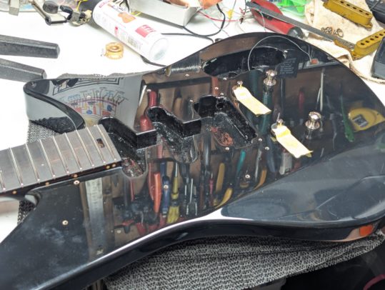 ピックアップキャビティの底には、念のために共振防止のスポンジを入れます。多分このギターは無くても平気だと思いますが、大昔これが無くてノイズに悩まされた経験があるので、おまじないみたいなものです。