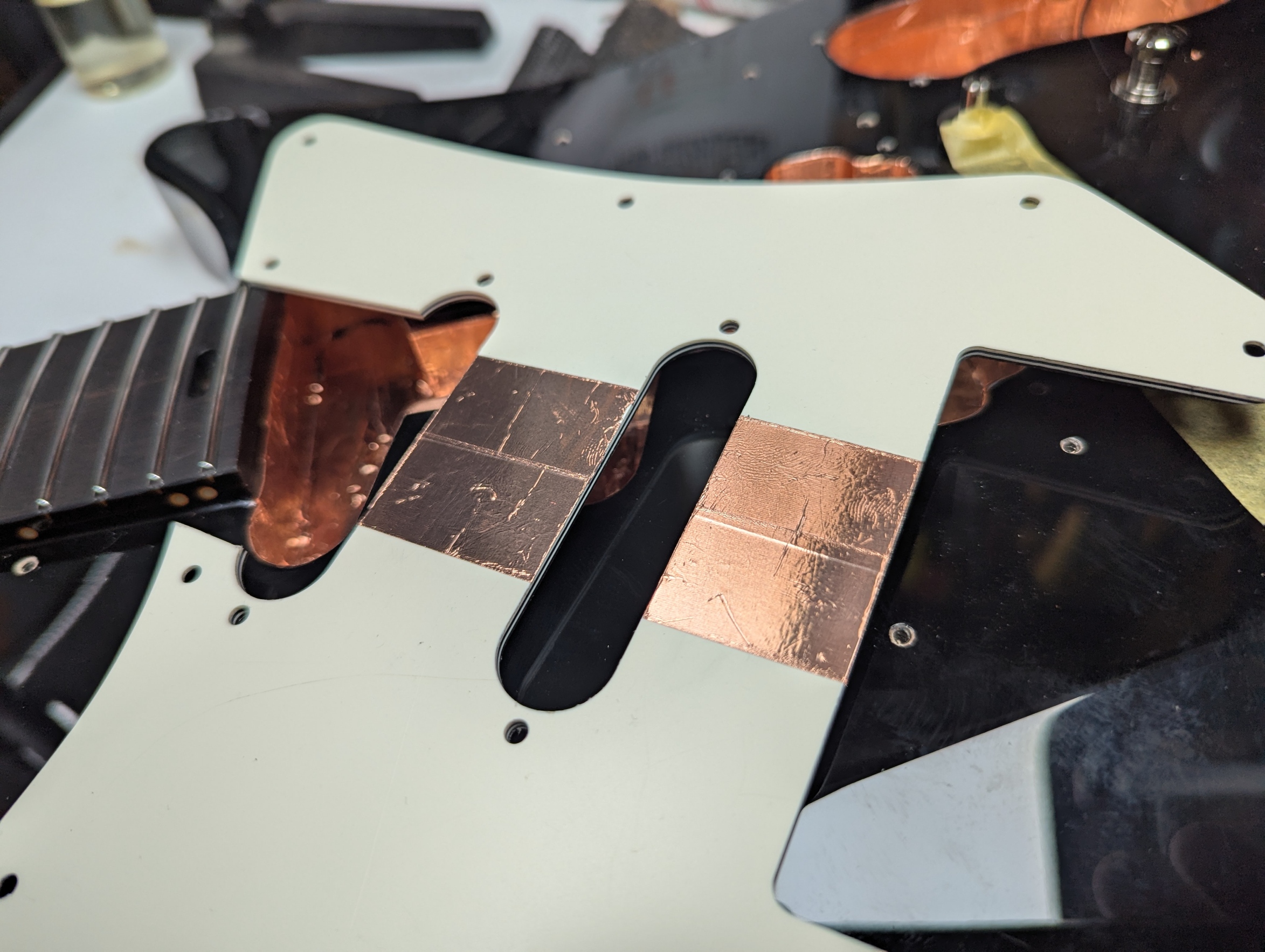 キャビティの蓋となる、ピックガード部分にも銅箔テープを貼りグランドに導通させます。