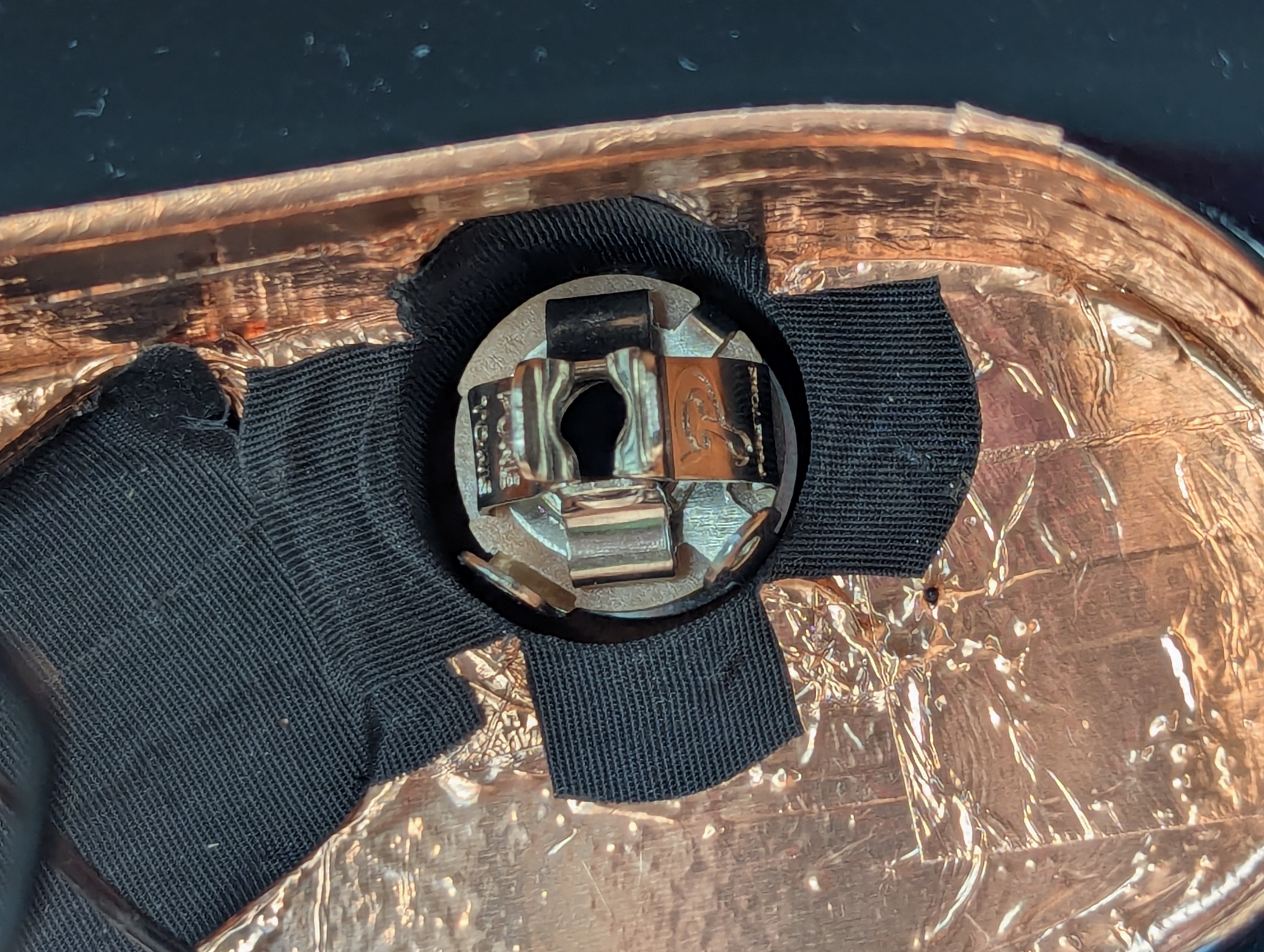 アウトプットジャックの穴の側面にも銅箔テープを貼ります。