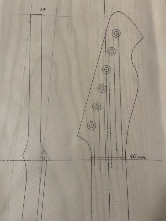 次に図面を製作。ヘッドの形は、2006年に自分でデザインしたグランドリオンのシェイプにしました。そして演奏時に肘に当たるボディ前面部分をエルボーカット(点線部分)。角度的にストラトのエルボーカットは肘のところに来ず、なんの意味もないと感じているので、僕の場合はこんな形にしてみました。さらに肋骨に当たるボディ背面部分にコンター加工。これも自分のギターポジションを考慮して最善の位置に来るようにしています。また高音域演奏時に当たる部分のカットラインも1弦側に点線で書いてます。ボディ背面の丸い点線は、そこに彫刻でもあしらおうという装飾スペースです。