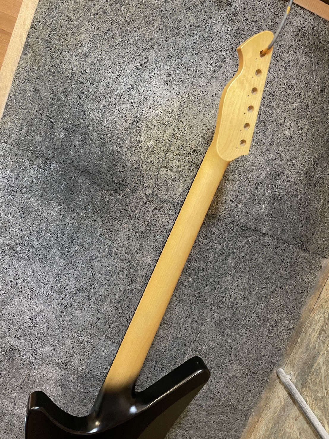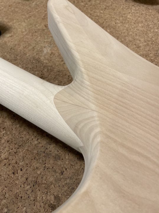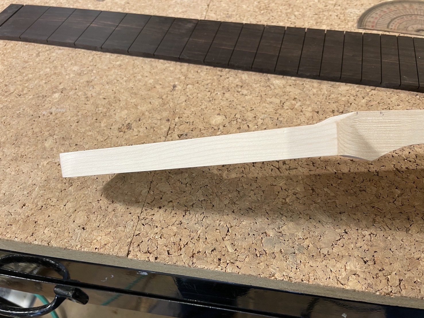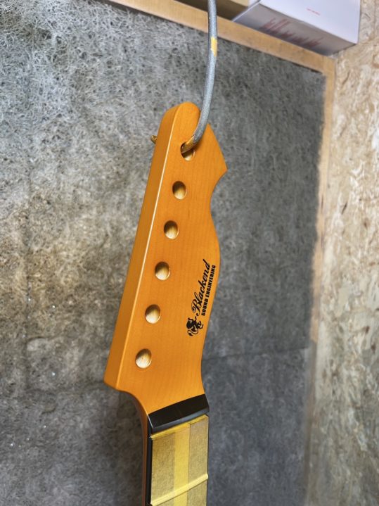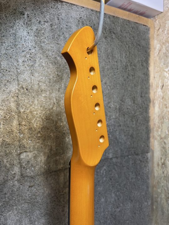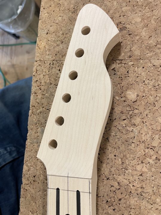 ヘッド角度付きのネックのため、いつも世話になっているアイモク様に通常よりも厚いハードメイプル材をご用意いただきました。
