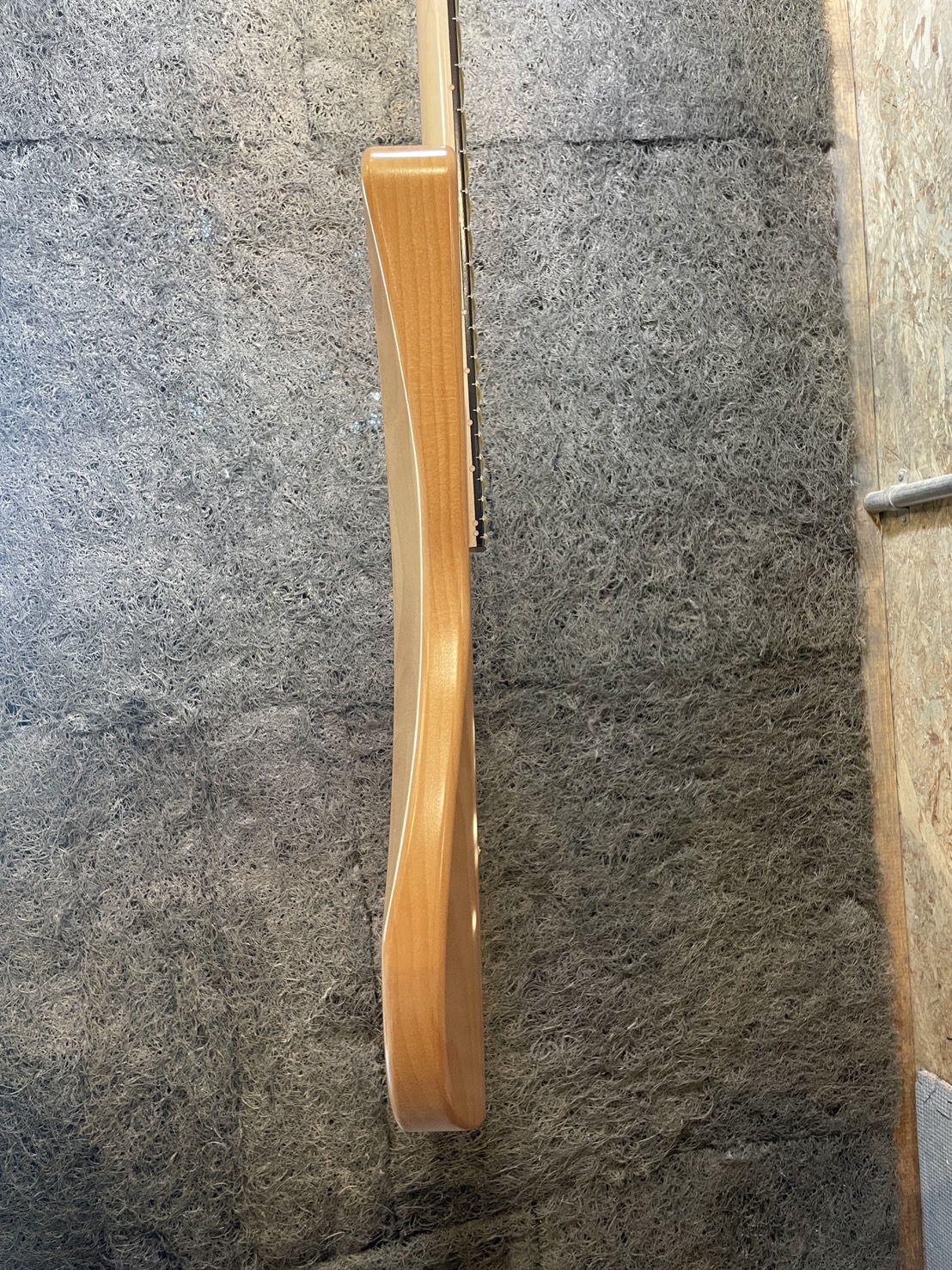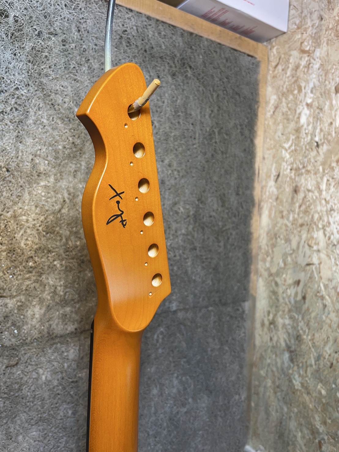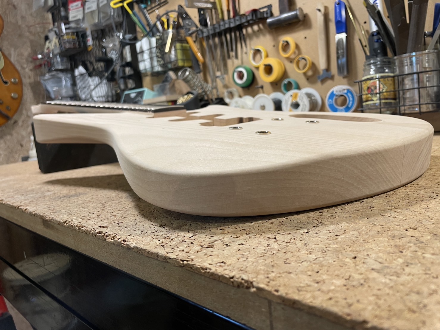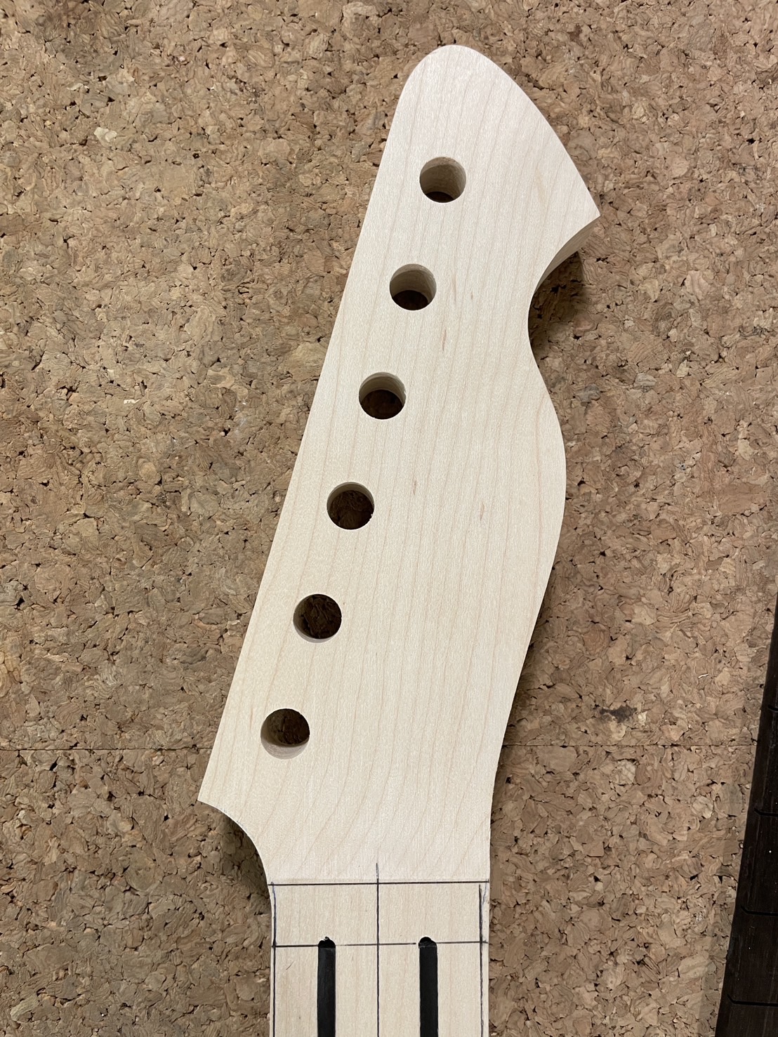 ヘッド角度付きのネックのため、いつも世話になっているアイモク様に通常よりも厚いハードメイプル材をご用意いただきました。