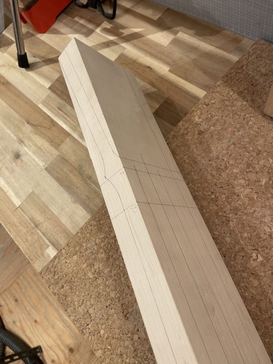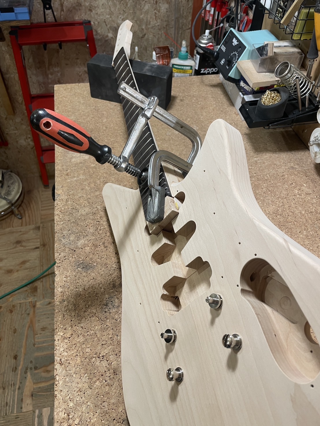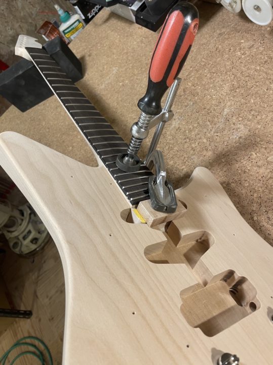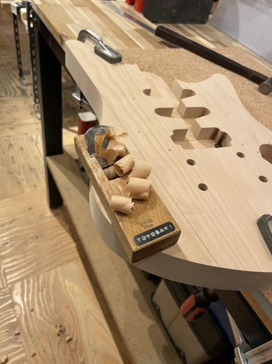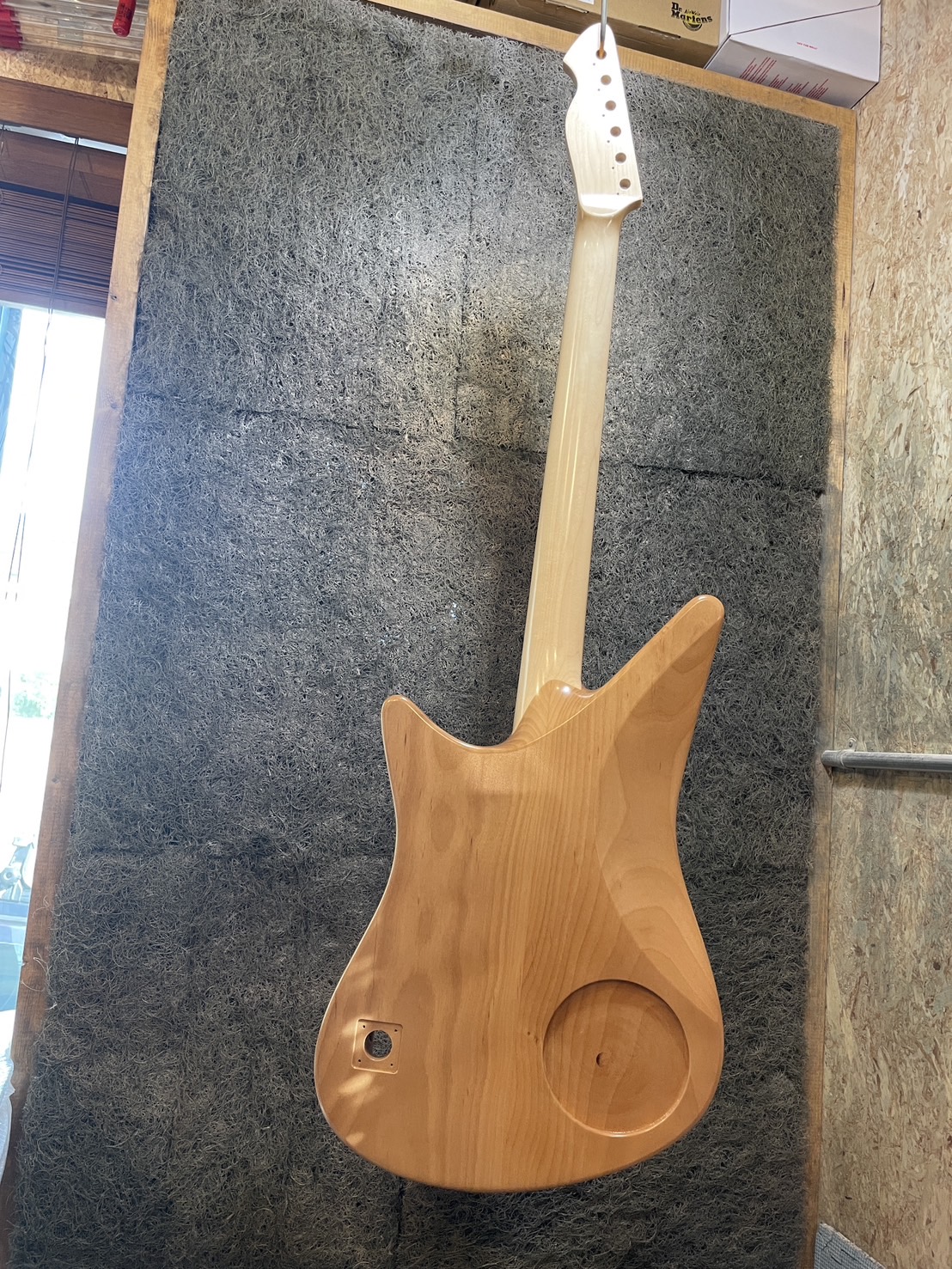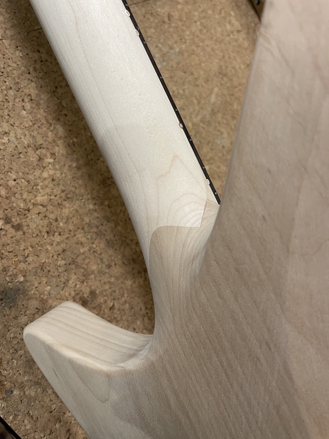ヘッド角度付きのネックのため、いつも世話になっているアイモク様に通常よりも厚いハードメイプル材をご用意いただきました。