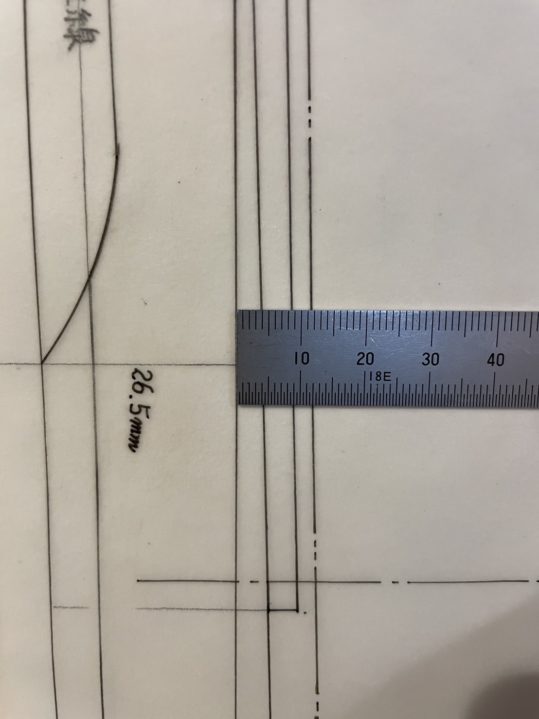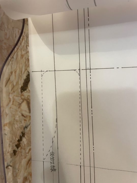 ここからは制作風景の写真となります。写真提供は豊崎職人です。僕が作った図面をもとに、トレーシングペーパーに図を起こしてくれました。もうこの時点でカッコイイ。