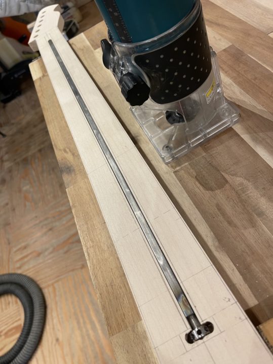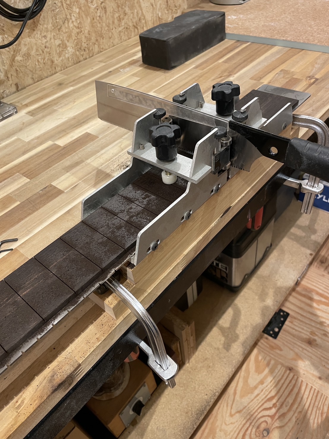 溝切り完了。メギドファイアを作った2014年当時は、どこの木材屋さんでも結構真っ黒なエボニー(黒檀)が安く手に入ったのに、今はこれくらいの茶色い品でも高価です。それでもオイルを塗れば結構黒いですけど。