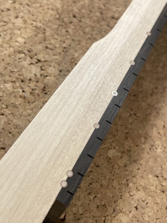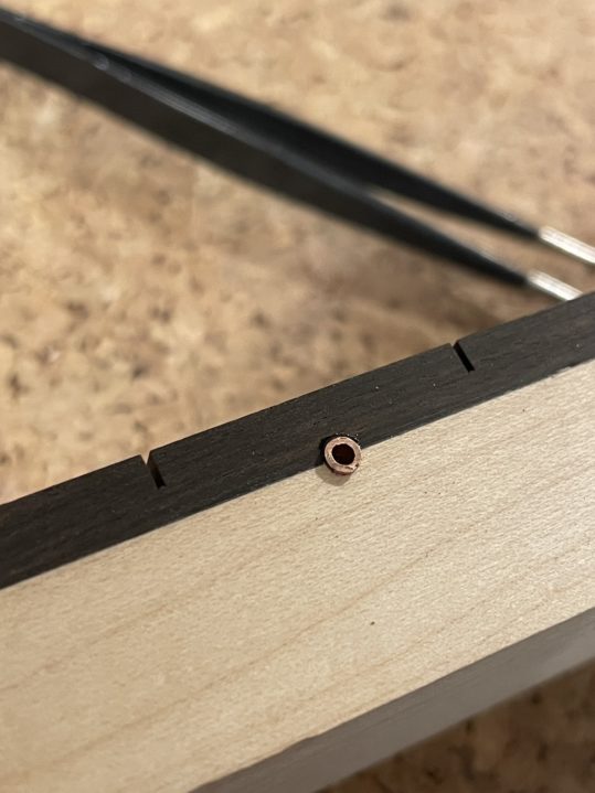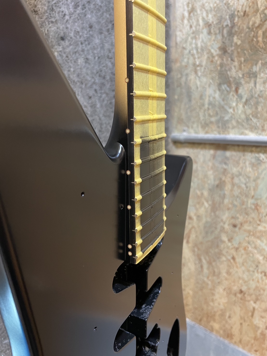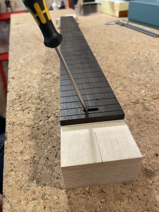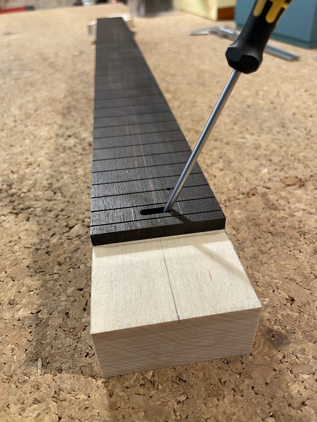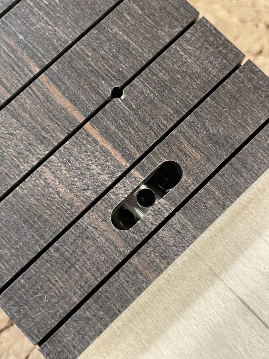フレット溝を利用して、ネックと指板がズレないように釘的な何かを打ち込んで固定します。丸い穴はそのためのもの。あとでフレットを打ち込むと見えなくなります。