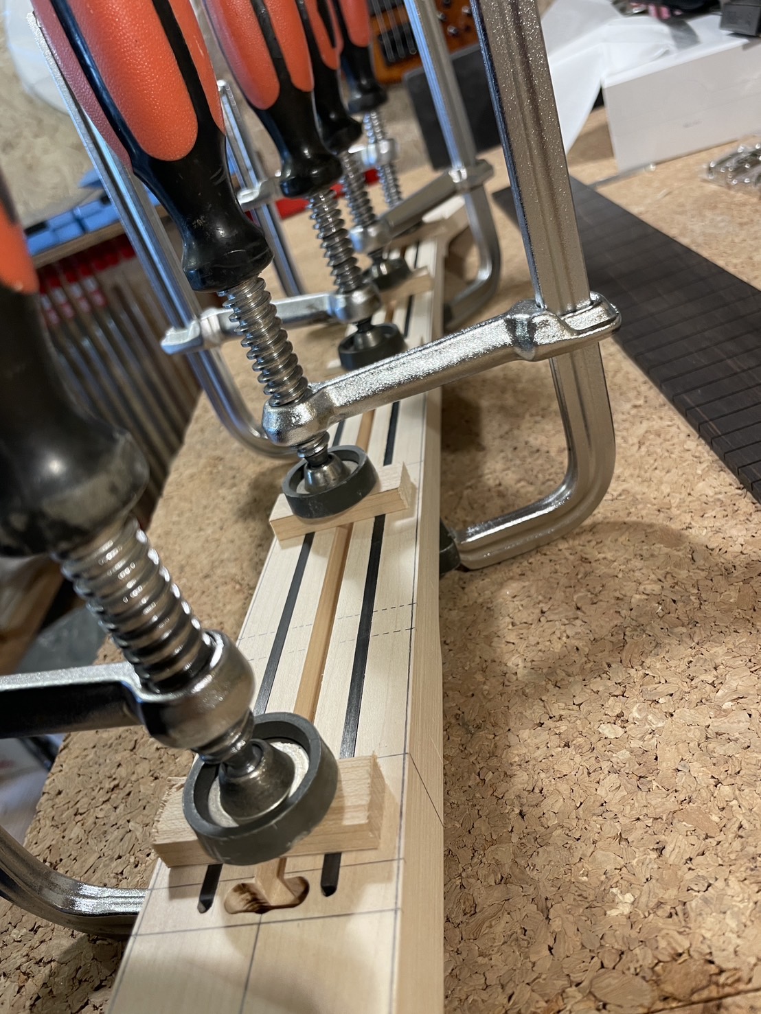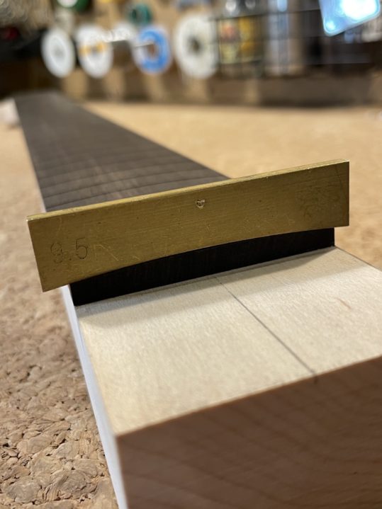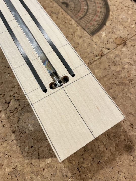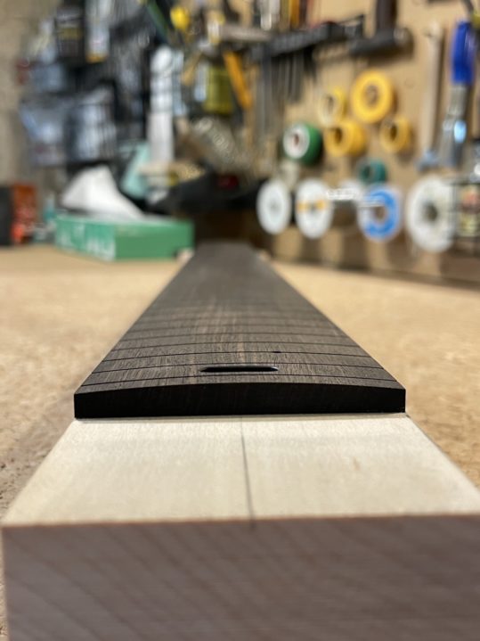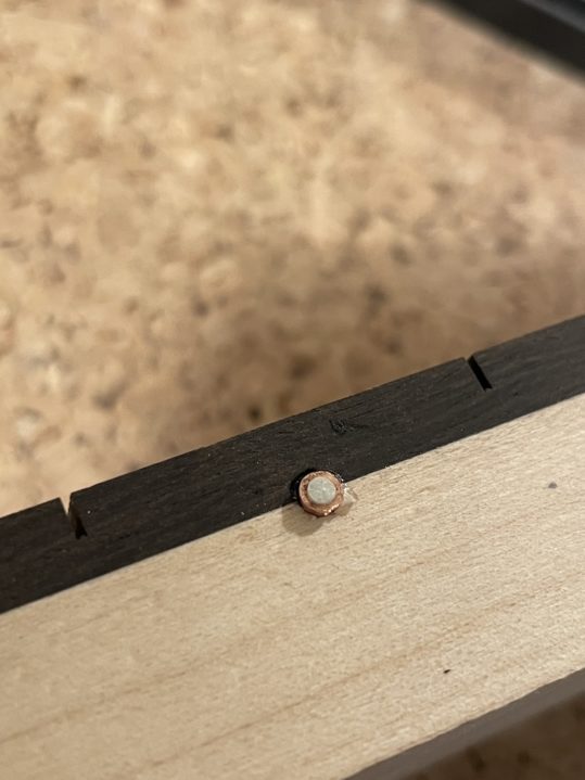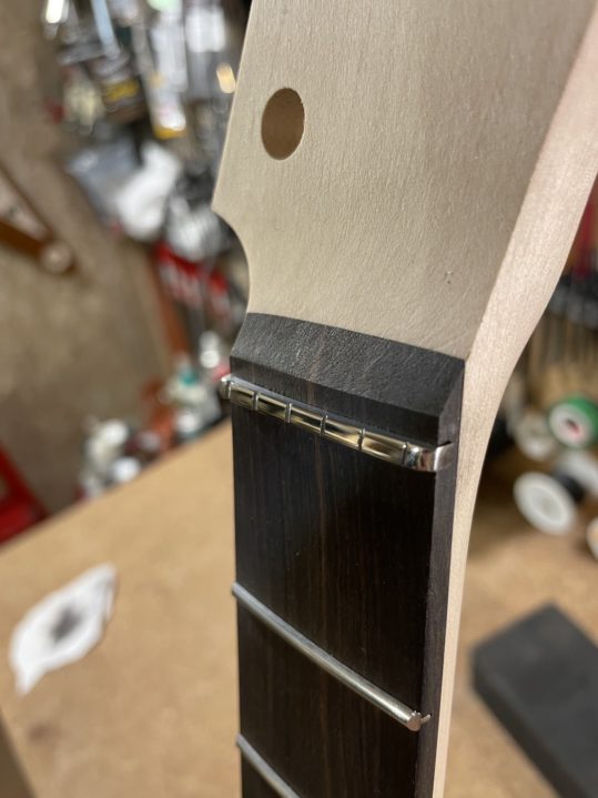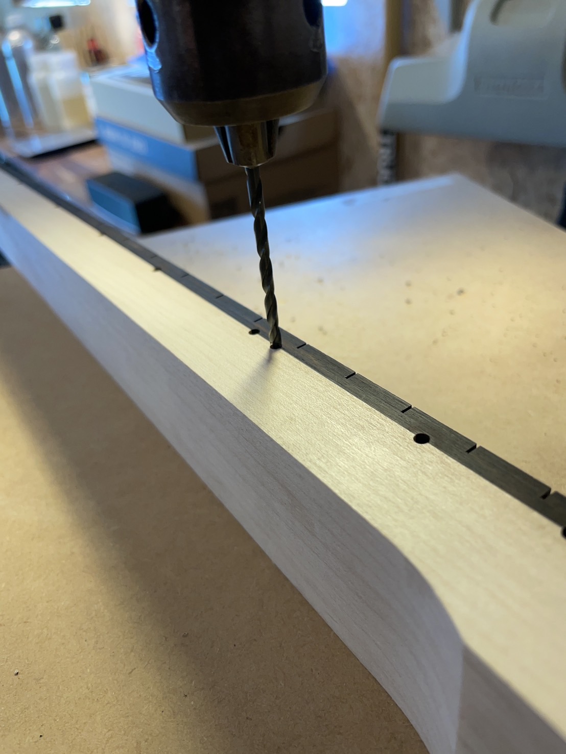 フレット溝を利用して、ネックと指板がズレないように釘的な何かを打ち込んで固定します。丸い穴はそのためのもの。あとでフレットを打ち込むと見えなくなります。