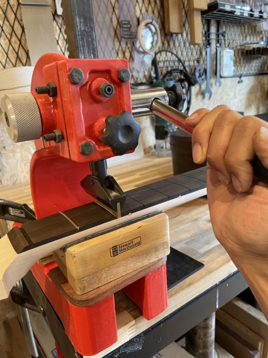 ステンレスのジャンボフレットを打ち込んでいきます。