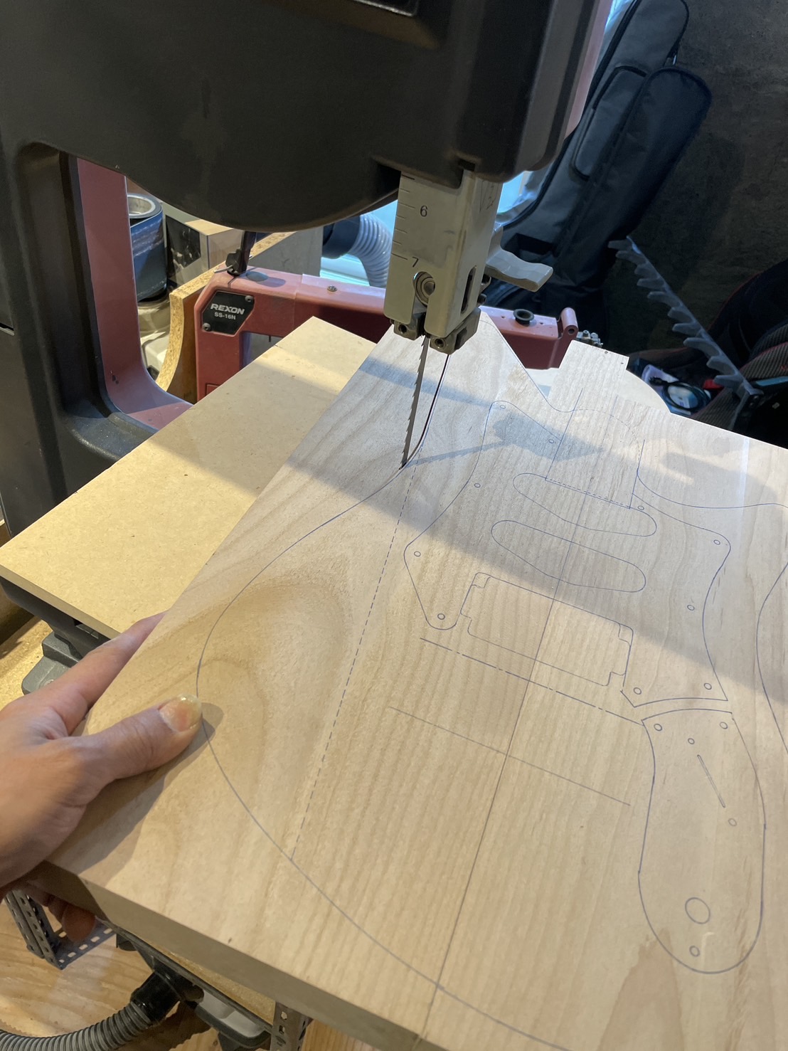 5月に入り、ネックの次はいよいよボディです。バンドソーでボディ材の外周を切り出しています。