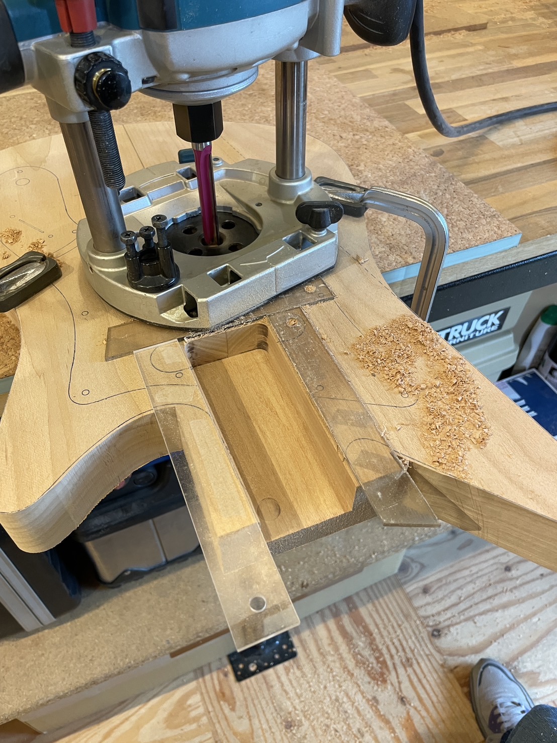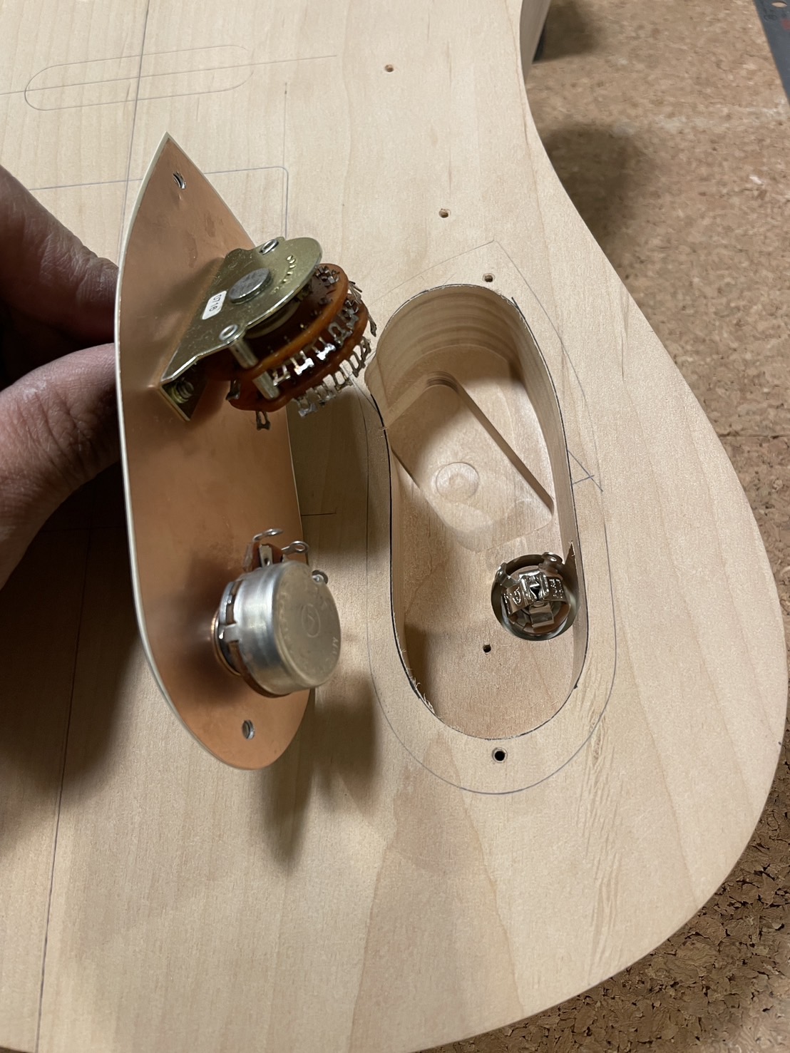 コントロールキャビティも座繰ります。4P5Tスイッチが大きいので、収納スペース確保のために内部でさらに空間が一段下がっています。
