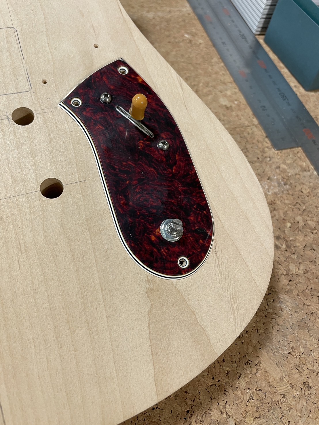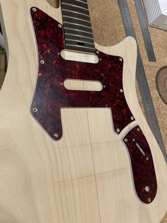 ピックガードも完成。今までどのギターも黄色べっ甲でしたが、グランドリオンの赤べっ甲に回帰したくなり、今回はこの柄にしました。
