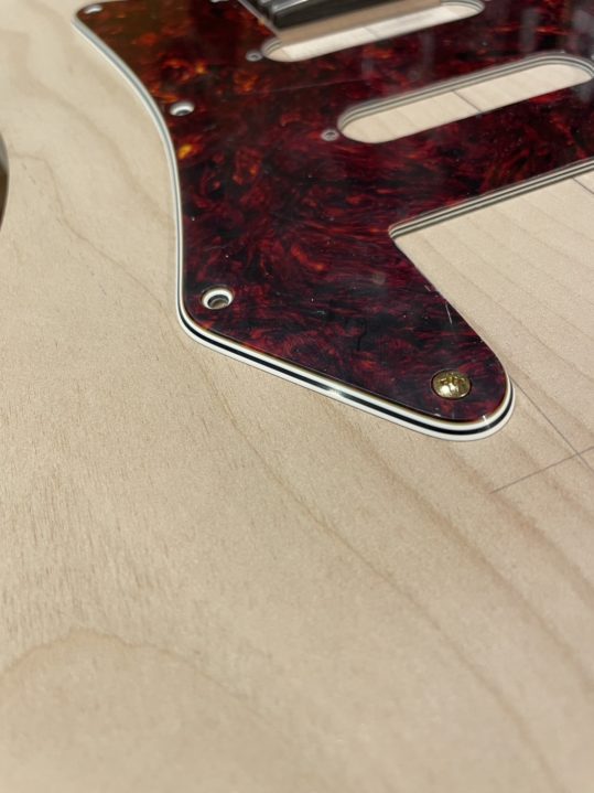 ピックガードの外周は斜めに面取りされています。ビスで仮止め。