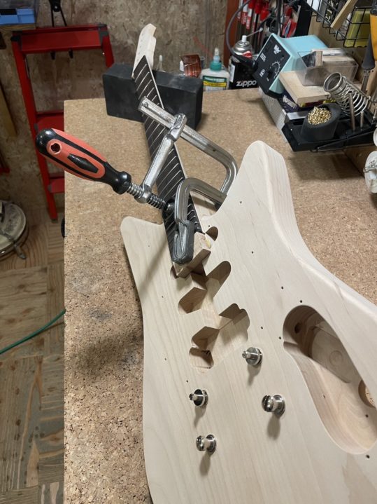 ストラトはボリュームなどのコントロールが右手によく当たるのがストレスでした。ですからいつもの慣れた距離感に配置。角度と距離感は他のオリジナルギターたちと同じ値になっています。