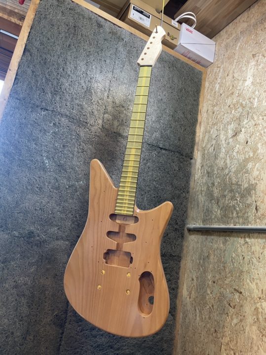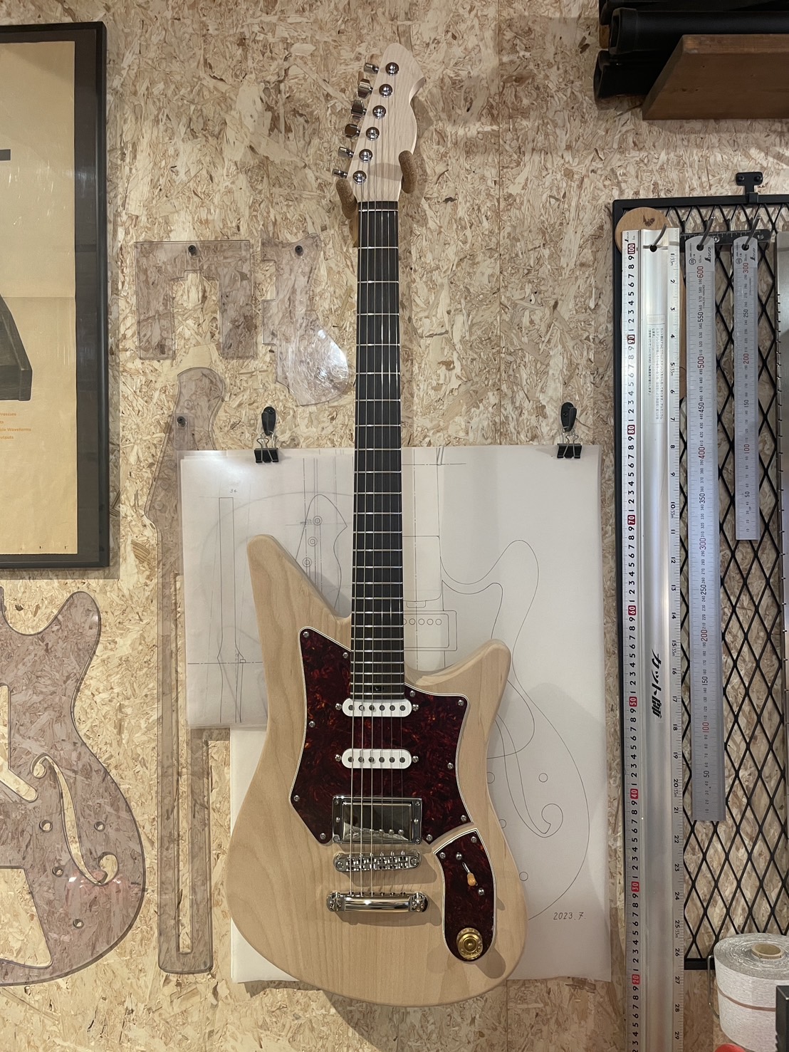 そして8月頭頃、塗装の研磨も終わって完成。豊崎職人からギターを受け取りました。パーツを仮組で載せたお写真。最高すぎる。