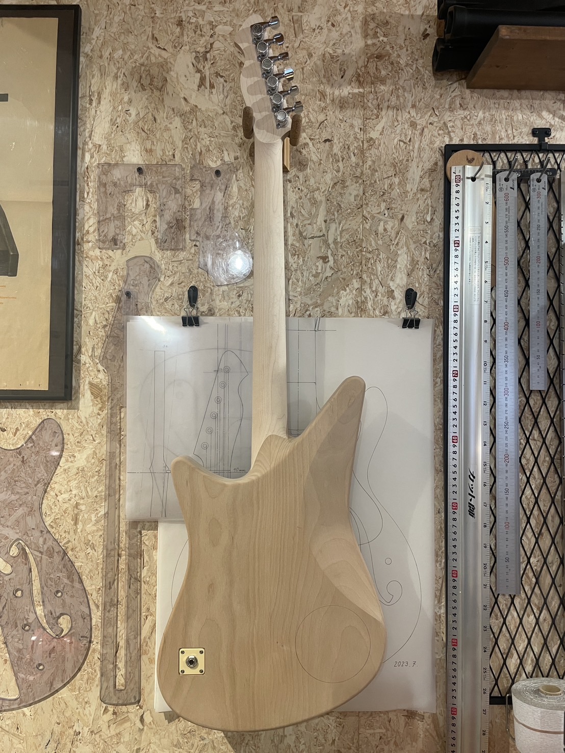 2024年の秋ごろ、新しいギターを作りたくてウズウズしていました。その頃、様々な音色が必要となるサポート現場では、2022年に入手したストラトキャスターが非常に便利で大活躍。しかしその弾き心地に慣れていった半面、どうしても許せないストラトの仕様にもストレスが溜まっていました。そこで、今までの自分のオリジナルギターの特性を継承しつつ、ストラトキャスターとの出会いで知った様々なメリット群を、すべて同時に盛り込んだ「僕が考えた最強のギター(現時点で)」を作れないかと思い立ち、友人づてに豊崎職人を紹介して頂きました。それが2024年の12月。ちなみに豊崎職人は、グランドリオンを製作してくださった伝説の林職人の教え子様でもあります。