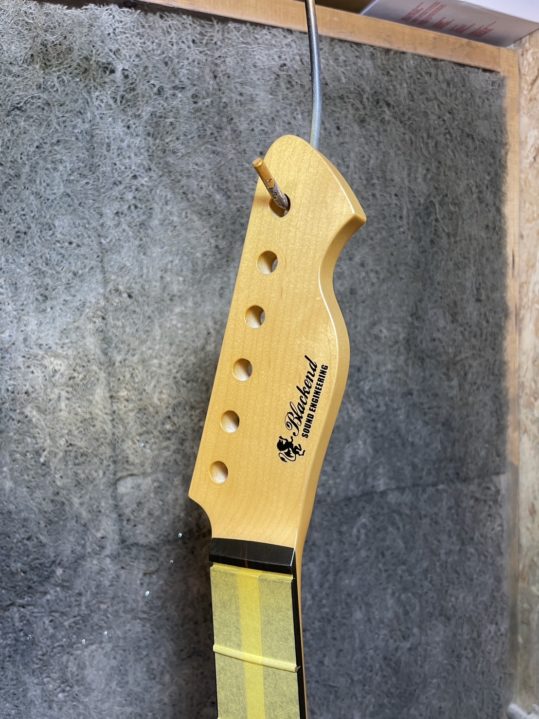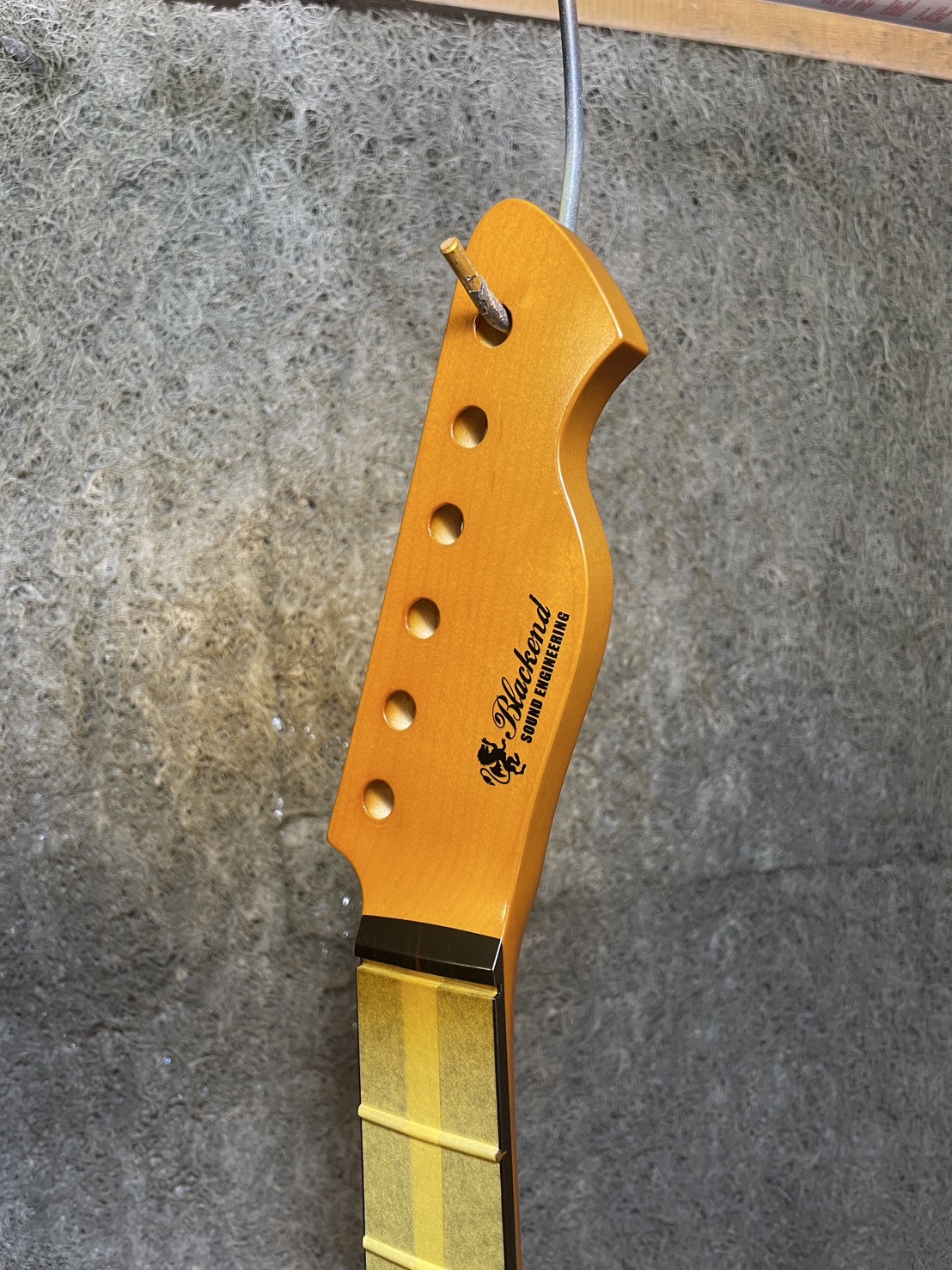 ヘッドにロゴが貼られ、ネックの飴色塗装の1回目。