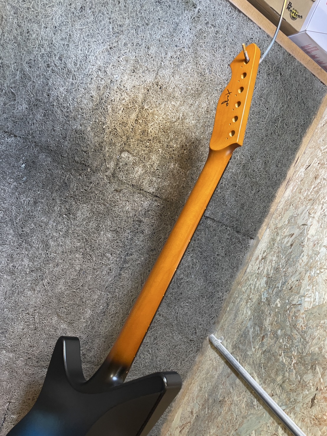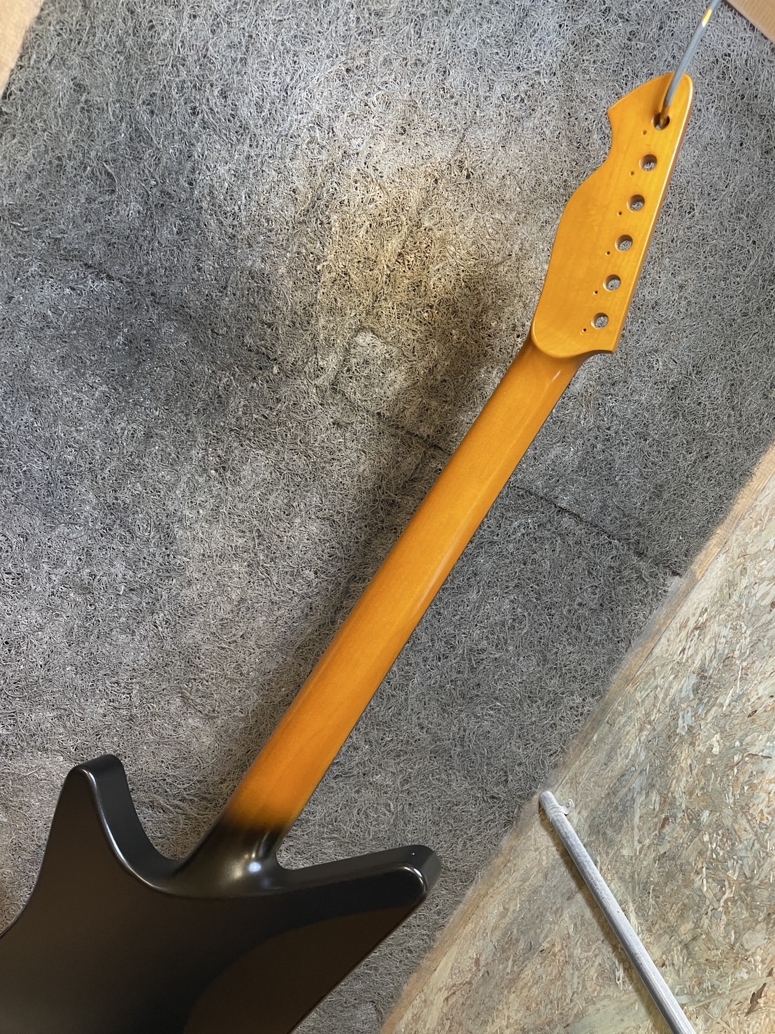 ネックの握り側の塗装は、艶消しでマットな感触にしてもらいました。ツルツル塗装だと、近年滑りが悪く感じることが増えたので。