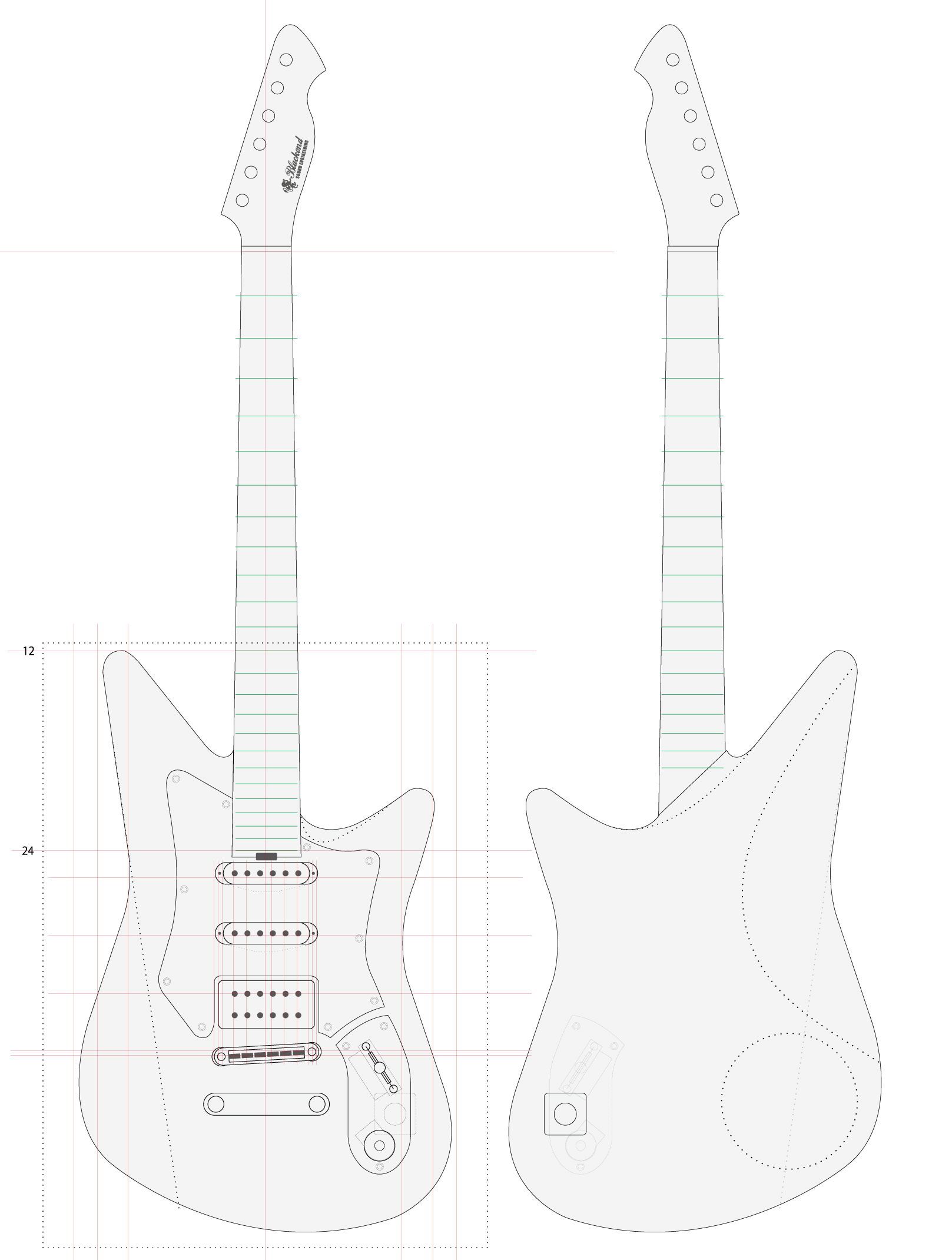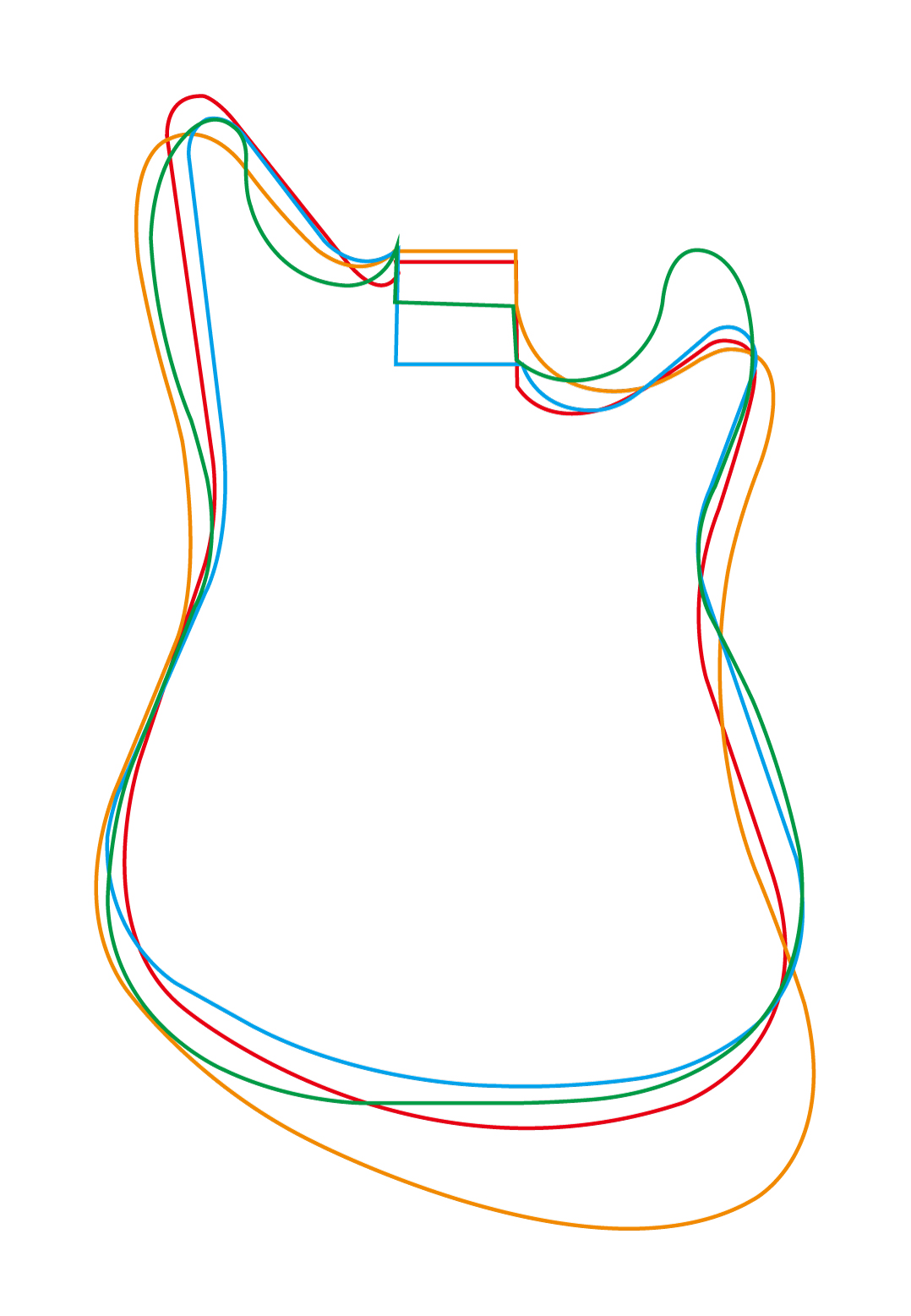 早速デザインを行いました。様々なギターのボディシェイプを分析し、自分なりのシェイプを作ってみました。下図の黄色い線が2014年製作のメギドファイア、緑が最近メインのストラト、水色の線がアルバートリーモデル、そして赤が今回のガルキマセラのボディ形状です。6弦側のツノの形状はアルバートリーモデルが好みだったので、それを意識しつつメギドファイアと中間あたりにし、抱えた時のボディバランスを考慮してなるべく遠くまで伸びるようにしました。1弦側のツノはメギドファイアのツノを少しシャープに。ウェストのくびれはストラトを意識しつつ、座りで引いた時のバランスを考慮してメギドファイアとの間くらいに設定。ボディエンド辺りは、リバースタイプのファイヤーバードを意識したメギドファイアでは、お尻を大きくし過ぎたなあと感じていたので、形状は継承しつつお尻を小さくし、ストラトにも寄ったようなシルエットにしてみました。