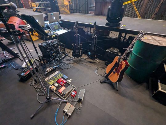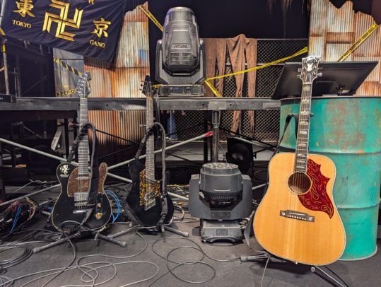 不良たちのアジト感のあるステージセットでした。使用ギターは左からグランドリオン2、Ormsby製ファンフレットギター、Gibson Japan様にお借りしたFirebirdというモデルのアコースティックギター。