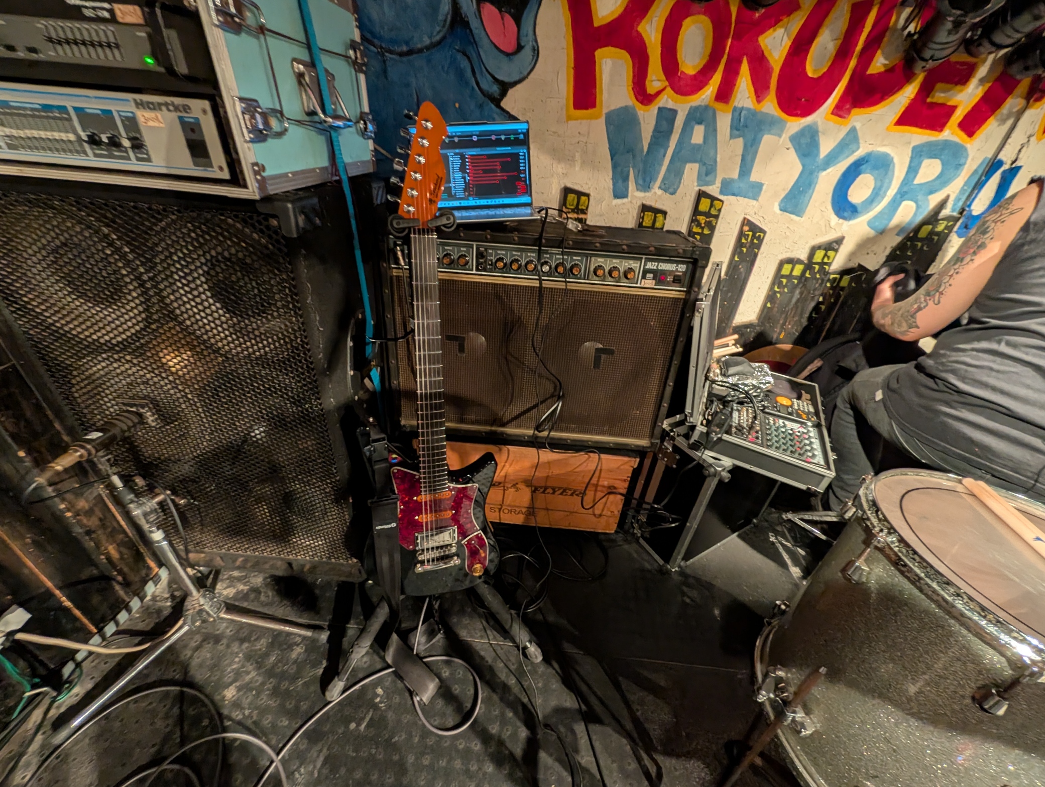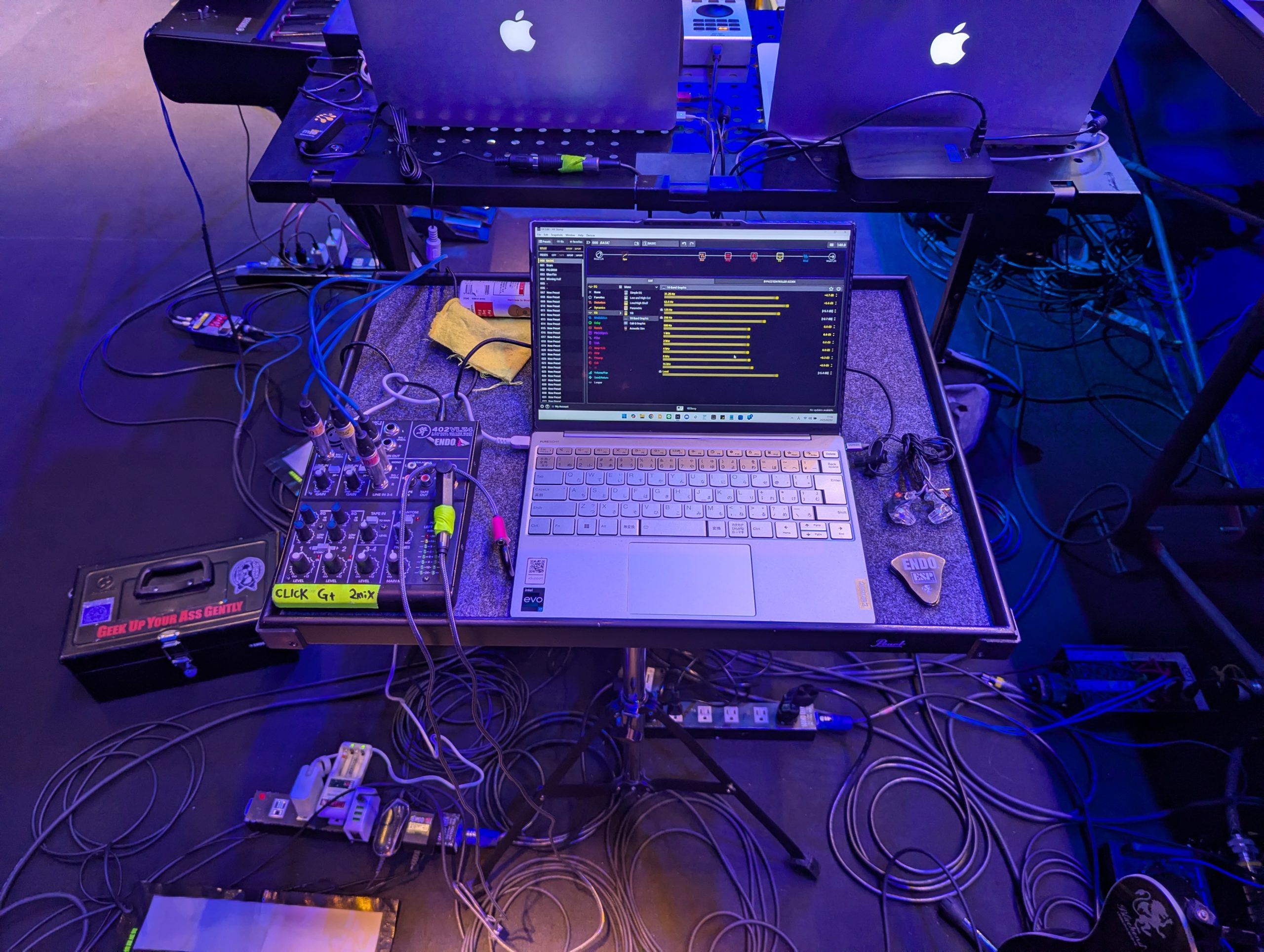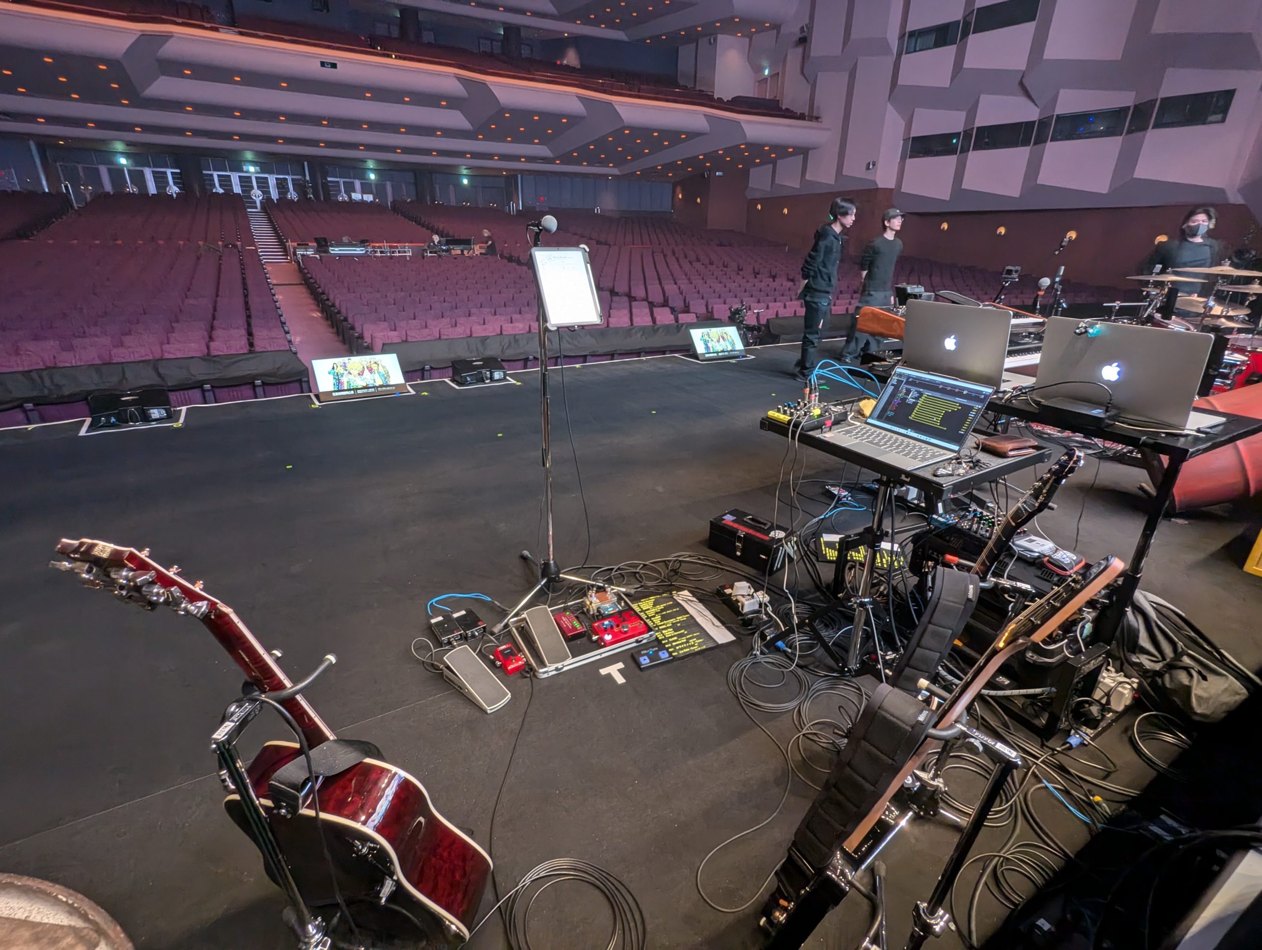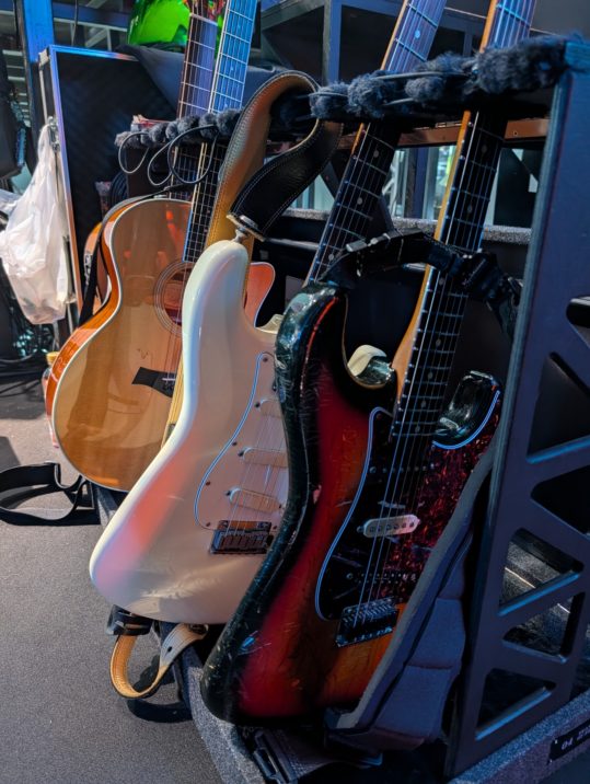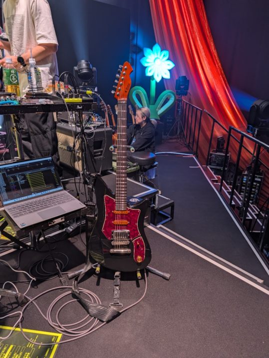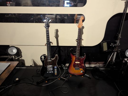 一応トラブル時のサブギターとして、リハやゲネからストラトを持ち込みましたが、一度も鳴らすことはありませんでした。奥のギターたちは月蝕會議のBilly氏の機材たちです。