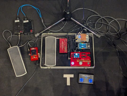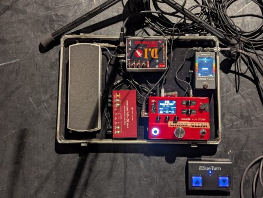 音の流れはギターの持ち替えがあったので入力はABボックス、その後はシンプルにチューナーを経てHX stomp、そしてVolペダル。写真左側は、アコギ用のチューナーと同じVolペダルです。やっぱりどんな現場でも、他の何を差し置いてもVolペダルだけは必須です。